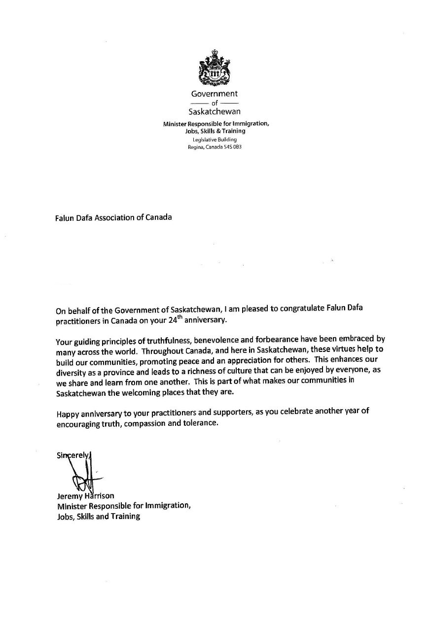 我很高兴代表萨斯喀彻温省政府,对庆祝法轮大法传世二十四周年的加拿大法轮大法修炼者呈上祝贺。