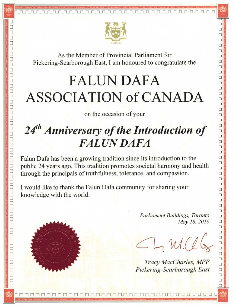 作为皮克林-士嘉堡东选区(Pickering–Scarborough East)的议员,我荣幸地在法轮大法传世二十四周年之际,向加拿大法轮大法学会表示祝贺。