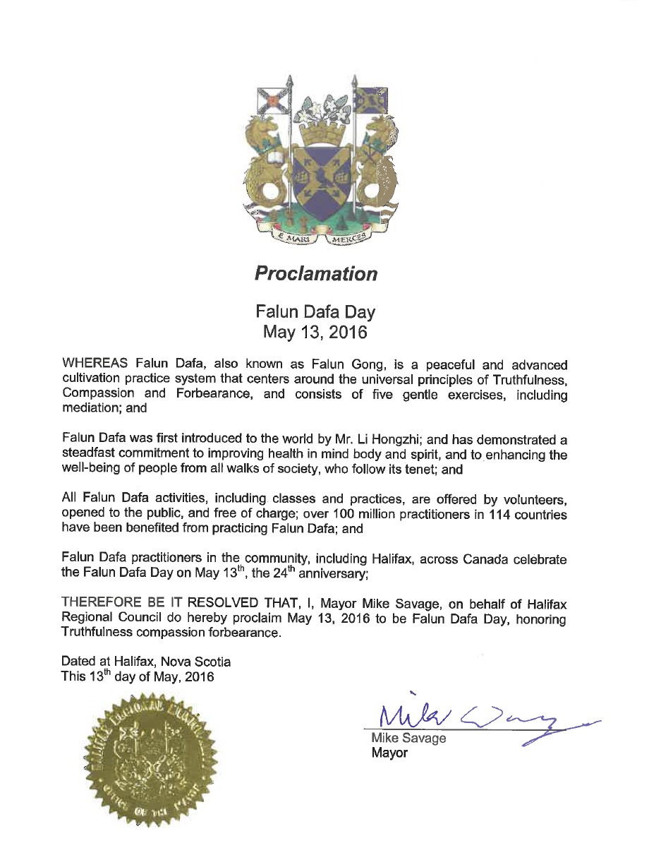 我,市长塞维治(Mike Savage),代表哈利法斯区域市议会宣布,二零一六年五月十三日为“法轮大法日”,以此对“真、善、忍”表示敬意。