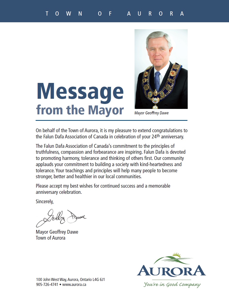 ![]() 安省奥罗拉(Aurora)市长达维(Geoffrey Dawe)的贺信 |