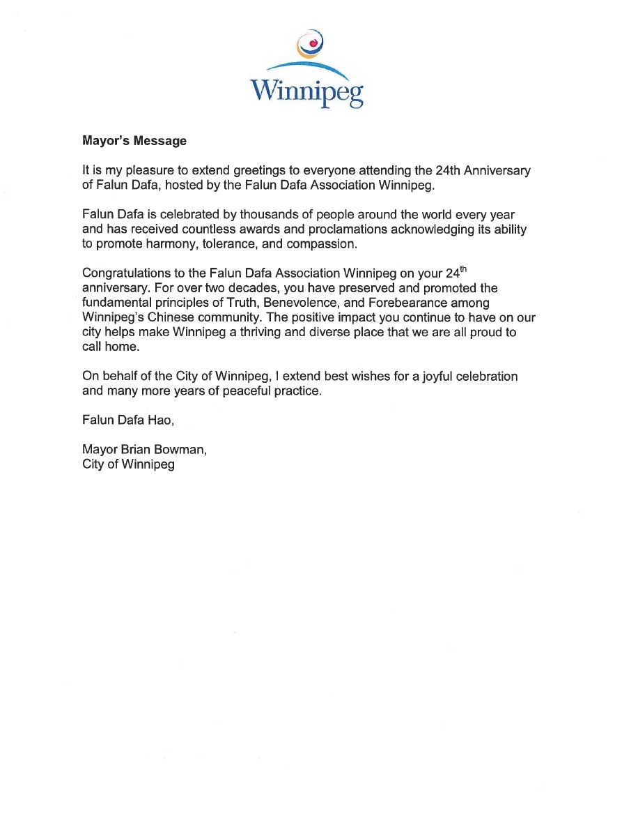祝贺法轮大法弘传二十四周年。在这二十多年间,你们对真善忍准则的坚守和传播,正的力量在不断帮助温尼伯成为一座兴旺和充满多元文化的城市。