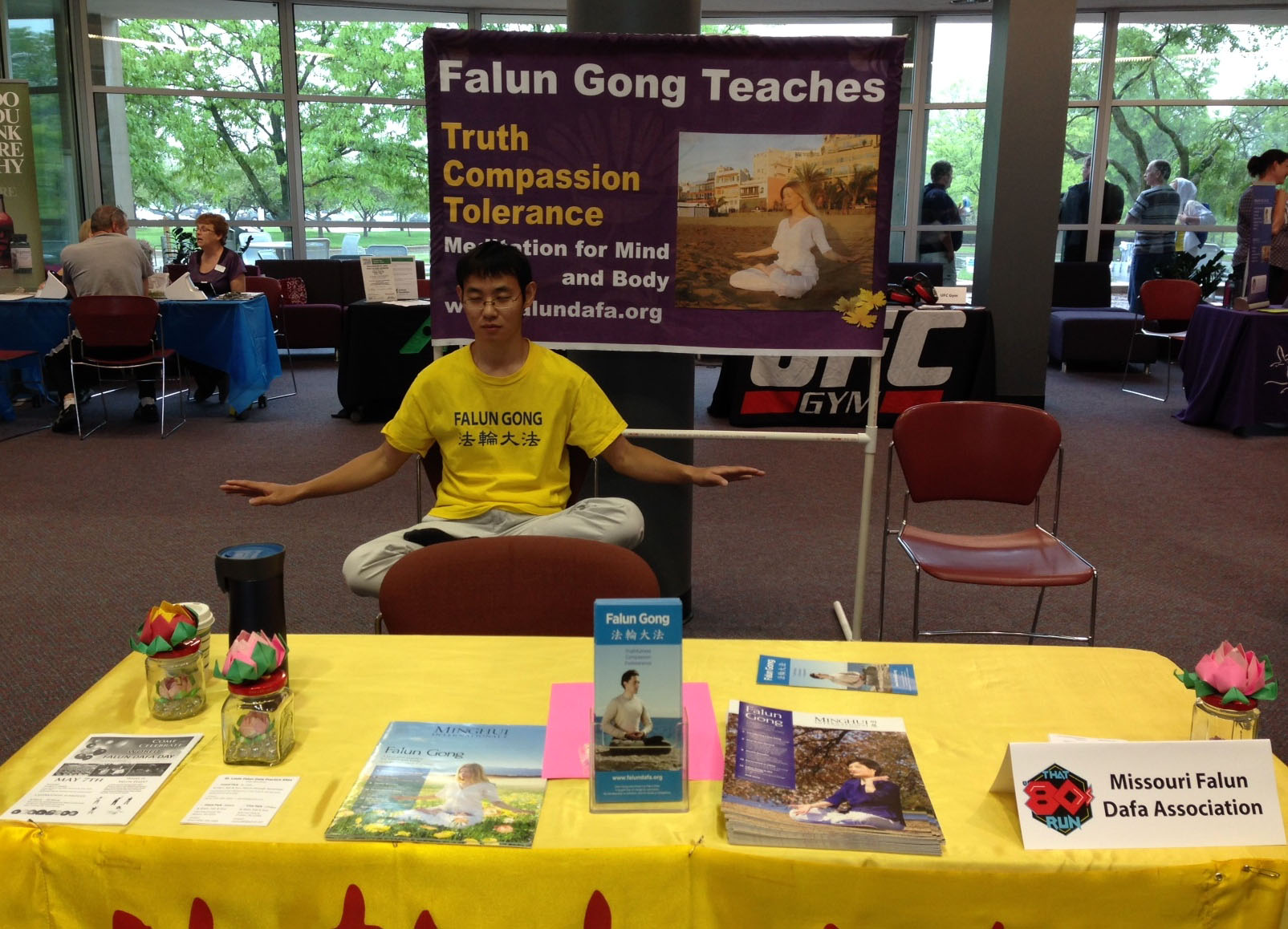 法轮功学员在展位上平静祥和的打坐吸引了许多人。不时有人过来询问功法的信息,很多人和学员交谈很久,深入了解功法以及法轮功在中国受到的迫害