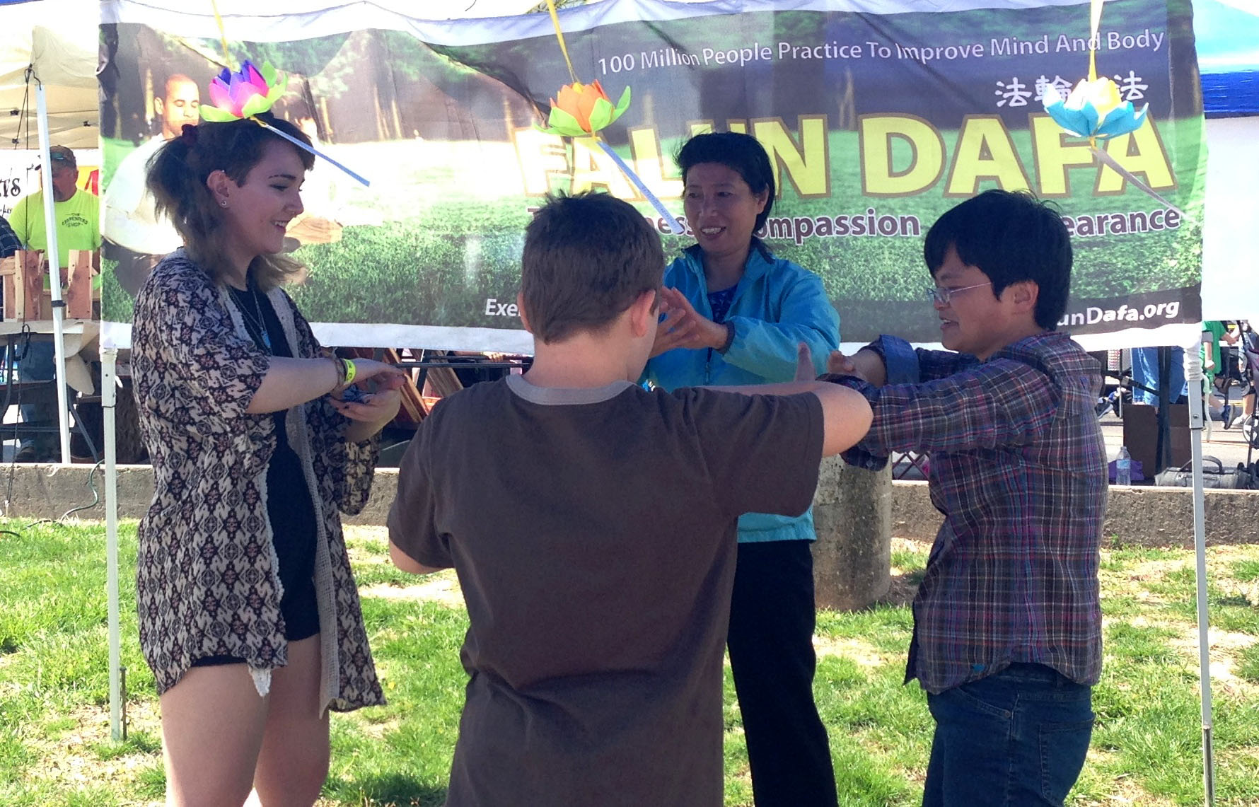 卡姆登顿市的茱萸节上,Alex和Dylan认真学习法轮功第一套功法