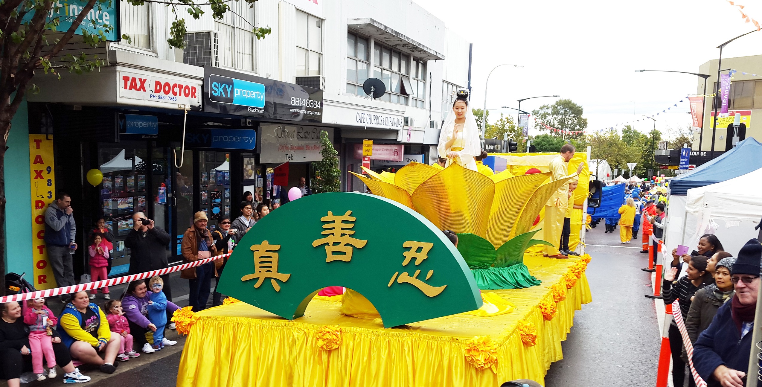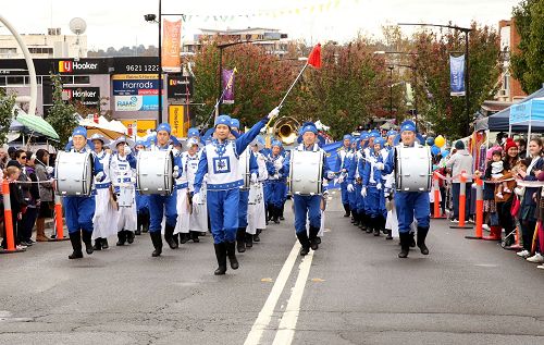 法轮功学员的方阵是在为游行队伍开道的澳洲骑兵队之后,他们威武雄壮、多姿多彩,在这个拥有七十多个社区团体参加的年度文化节游行中备受各界瞩目。法轮功游行队伍由天国乐团、腰鼓队、大型花车和彩旗队组成。每个队阵以不同的服饰和表现形式呈现了中华民族优美的传统文化,赢得在场观众的热烈欢迎和掌声。