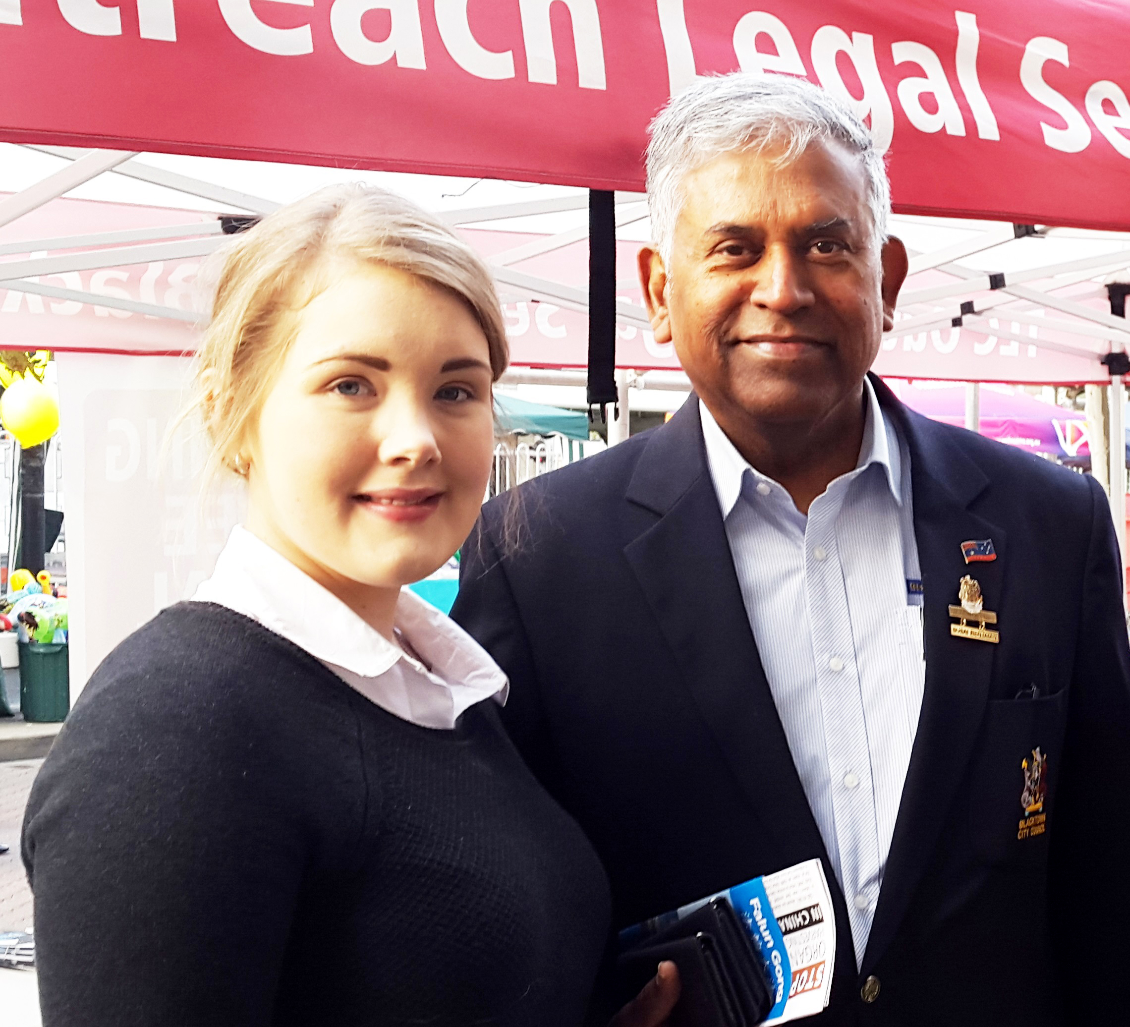 ![]() 图7:黑镇市政厅市议员苏萨(Blacktown Councillor Susai Benjamin)(右)表示法轮功学员是一群好人,表现超凡脱俗 |