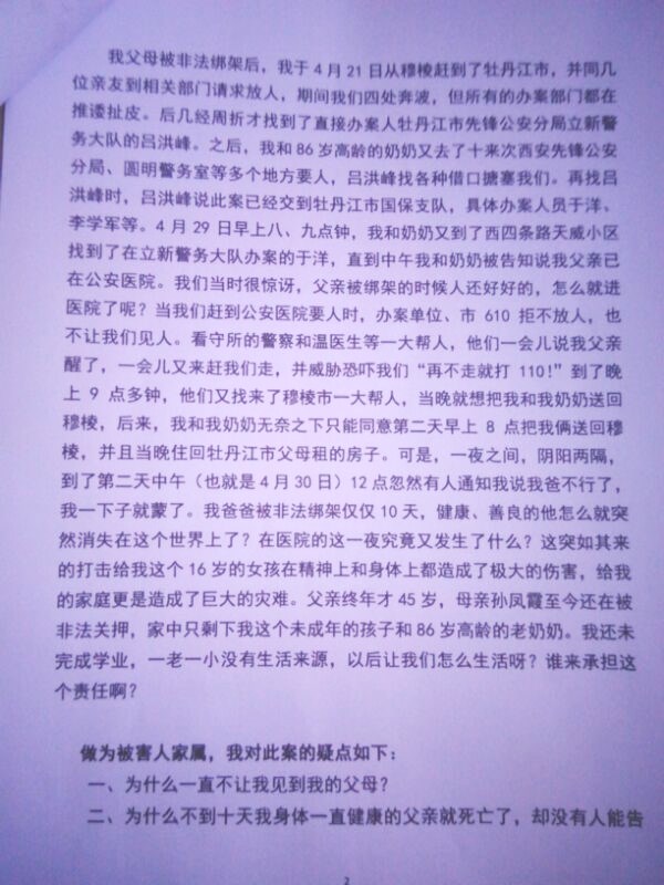 我今年才十六岁,一个多月前还是高高兴兴的一家人,突然间我没了爸爸,妈妈又被非法关押在牡丹江看守所里。爸爸是在看守所被关押不到十天就离奇死亡的,尸体又被强行解剖。看到我爸尸体表情,就知道我爸爸死的非常痛苦。我怎么也想不明白,警察怎么这样狠!!为什么对信真善忍的爸爸下如此毒手?