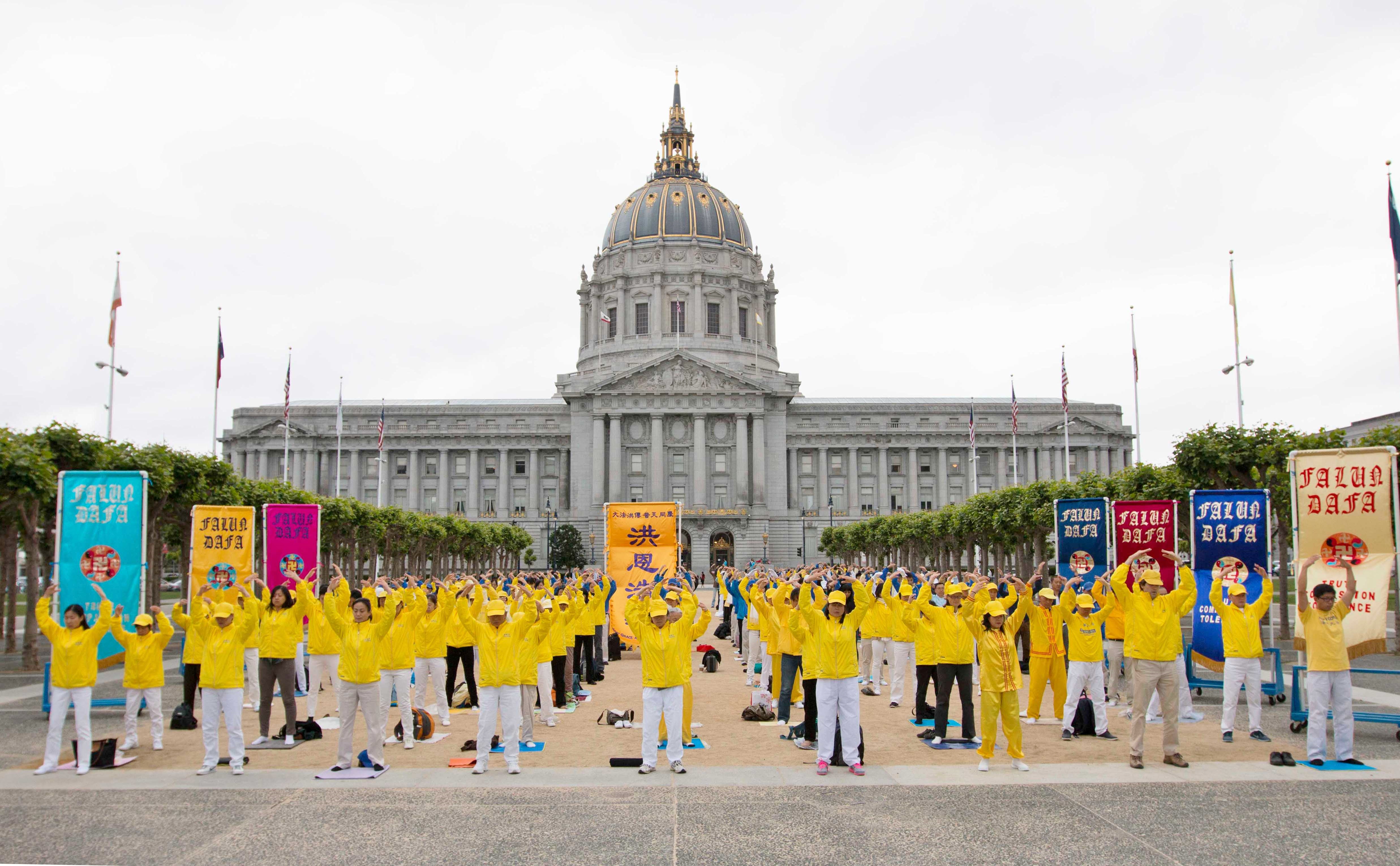 ![]() 图1-2:二零一六年五月七日九点,北加州的法轮功学员聚集在旧金山市政广场以大炼功,拉开庆祝“五一三”世界大法日。 |