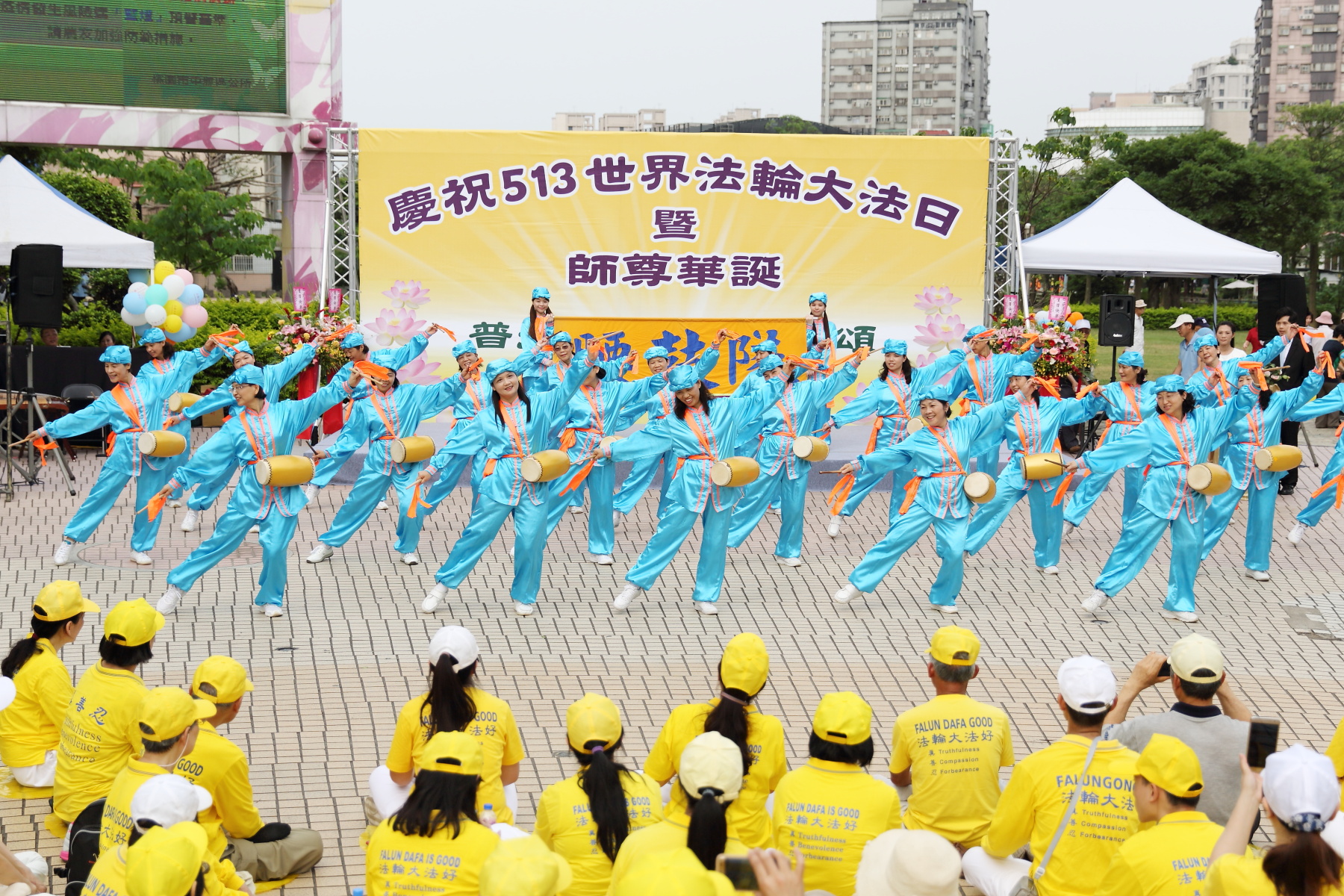 而来由苗栗学员组成的腰鼓队,以喜悦的心情、整齐的队伍,表演“欢庆大法日”、“迎新春”等曲子。成员中的年龄从二十多岁到七十多岁都有,平时练习时心很齐,好几次刚要出门就遇刮风大雨,骑机车连裤子,鞋子都湿了,仍然坚持不缺席,为的就是在表演时把最好的一面带给大家。