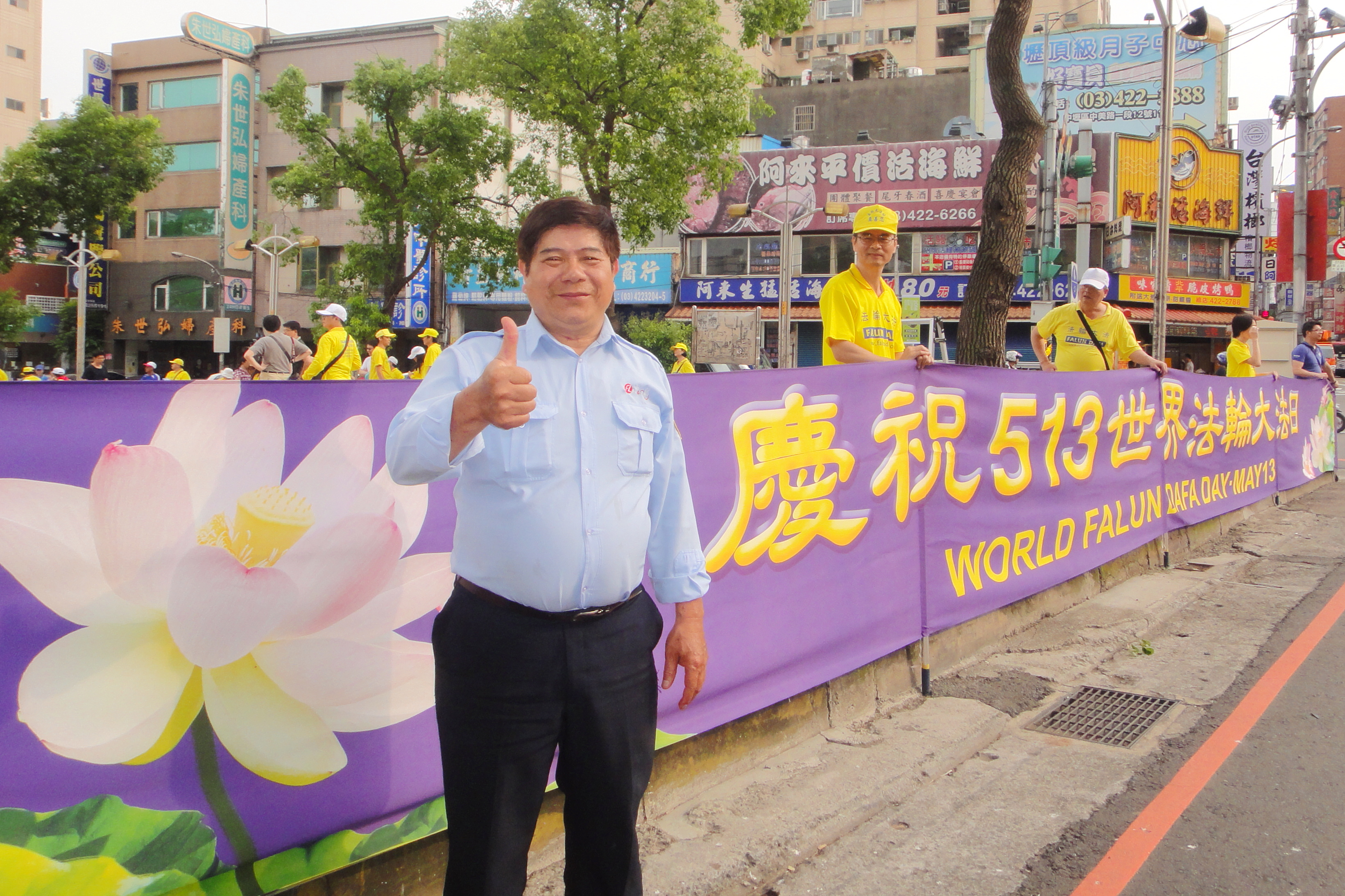 来自杨梅的胡莒原在一旁专注观看台上的演出,他表示,被法轮功学员的歌声吸引,驻留超过半小时。他津津乐道分享自己住在苗栗的大舅子,曾经罹患食道癌,术后走入修炼,经过炼功,十多年来生活状况很良好,也因此常向亲友推荐法轮功。胡先生竖起大拇指,表示法轮大法很好。