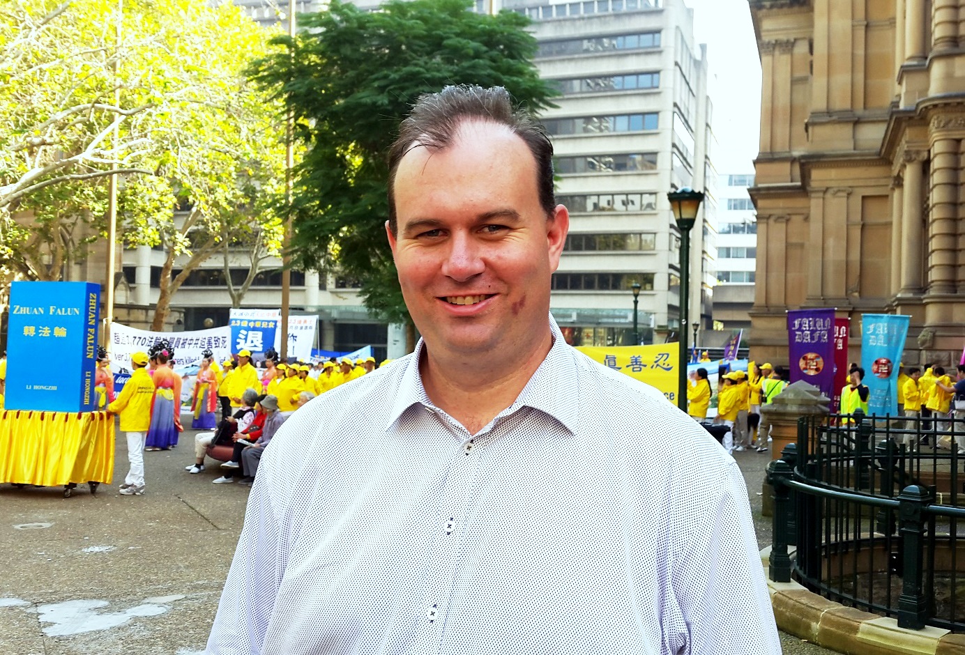 市议员安德鲁•威尔逊(Andrew Wilson,Parramatta City Council Councillor)先生也到场支持加入游行队伍。他表示:非常高兴的祝愿世界法轮大法日!并祝愿今天的活动圆满成功!