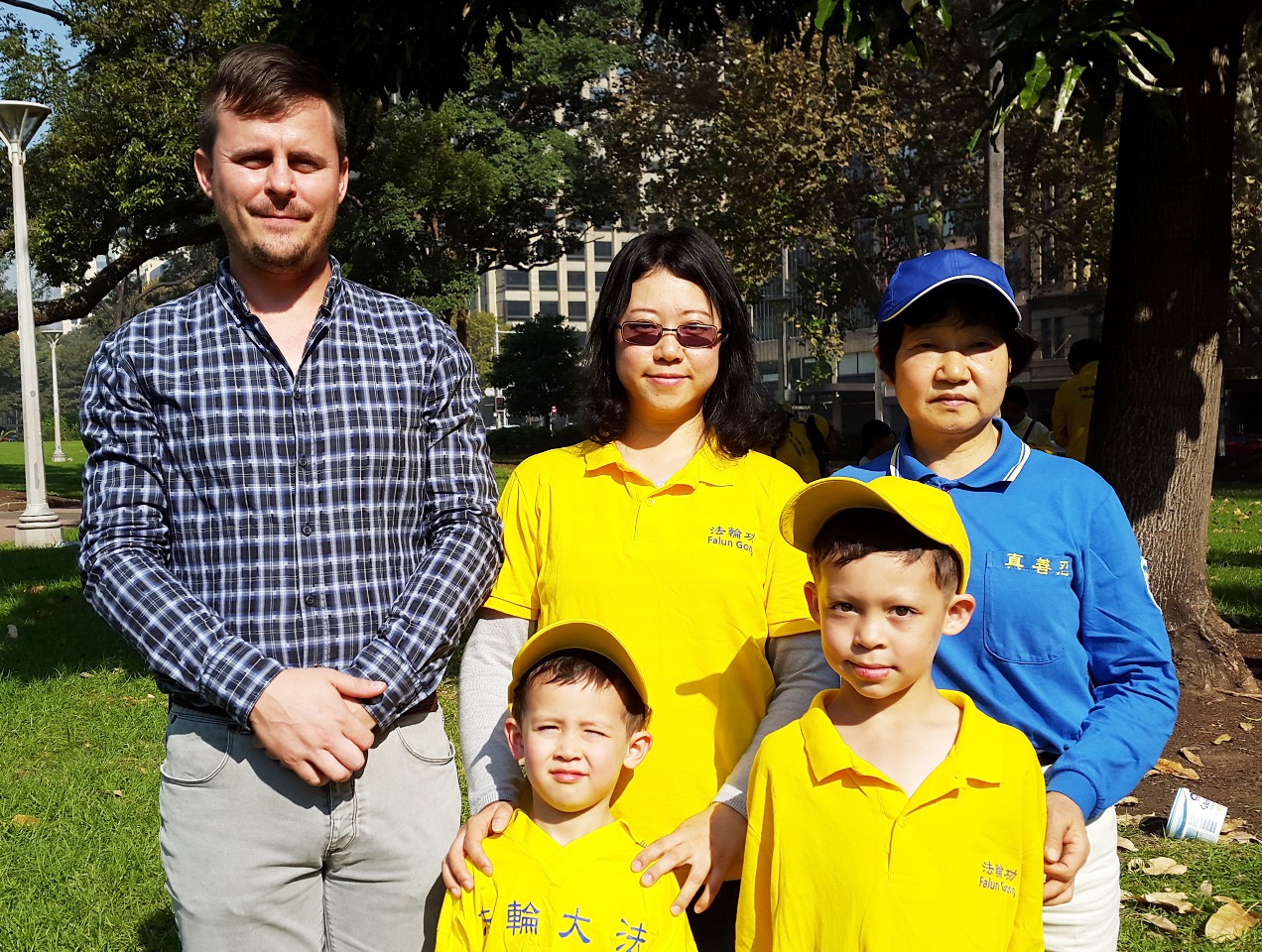 法轮功学员格兰(Glen McRae)和妻儿、岳母一起参加了游行,格兰感觉到修炼法轮功让他家庭和睦,生活平稳,他说:“我们家已经从修炼法轮大法中获益良多。我们不再为琐碎的事情整天争斗。相反,这已经被安宁与稳定的生活状态替代了。这是我们很久没有经历的了。”