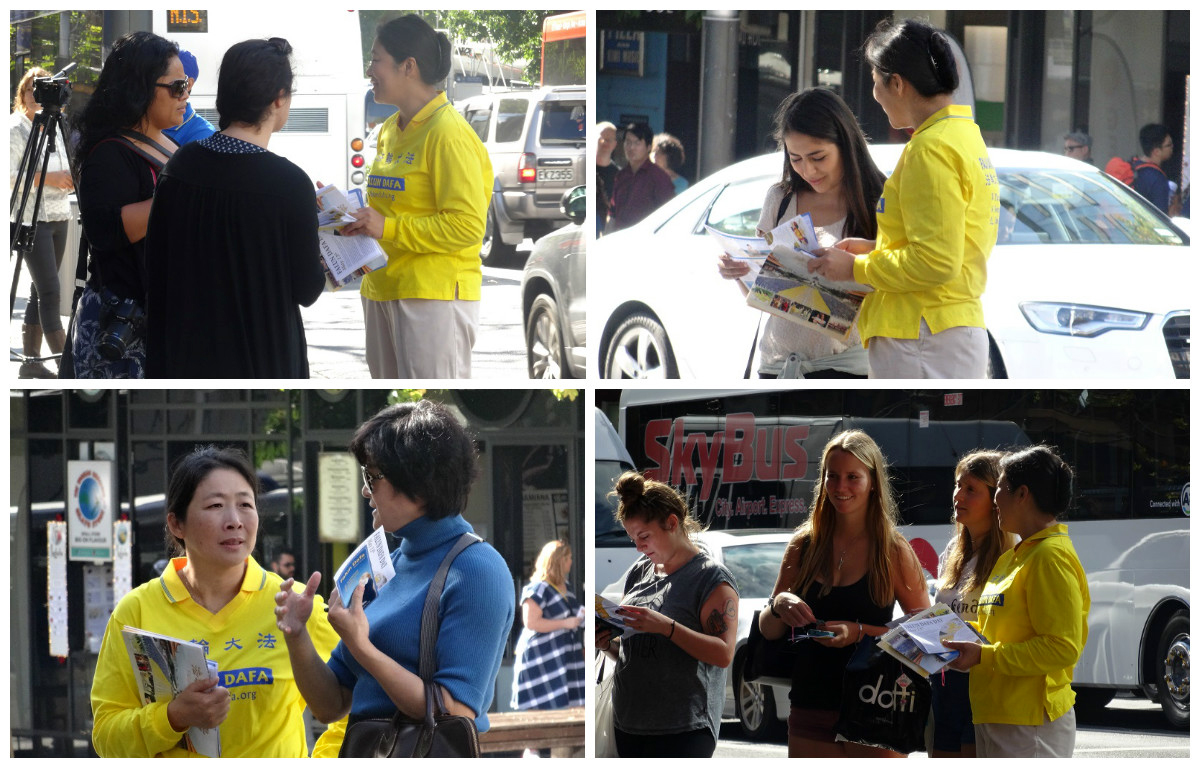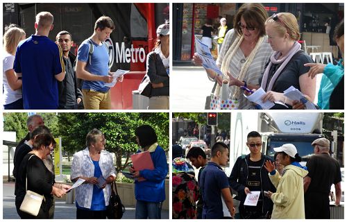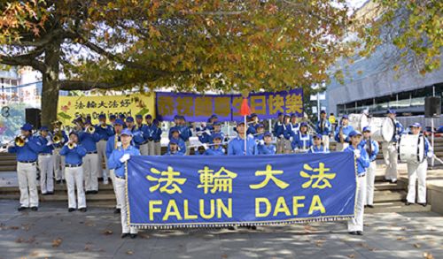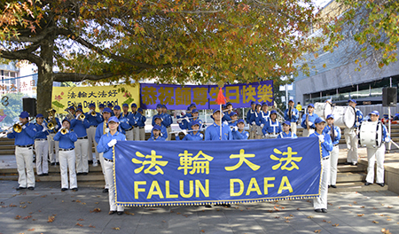 由法轮功学员组成的天国乐团以及腰鼓队的表演吸引了许多路人驻足观看,还有许多法轮功学员向路人散发真相资料,并讲述法轮功真相。