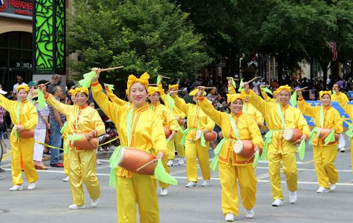 参加游行的法轮功队伍由莲花车、仙女队、腰鼓队和舞龙队组成。莲花车上,中西法轮功学员展示着优美舒缓的法轮功五套功法,仙女队身着传统汉服的女学员端庄优雅,腰鼓舞活泼明快,金色巨龙气贯长虹,为观众留下了美好的印象。