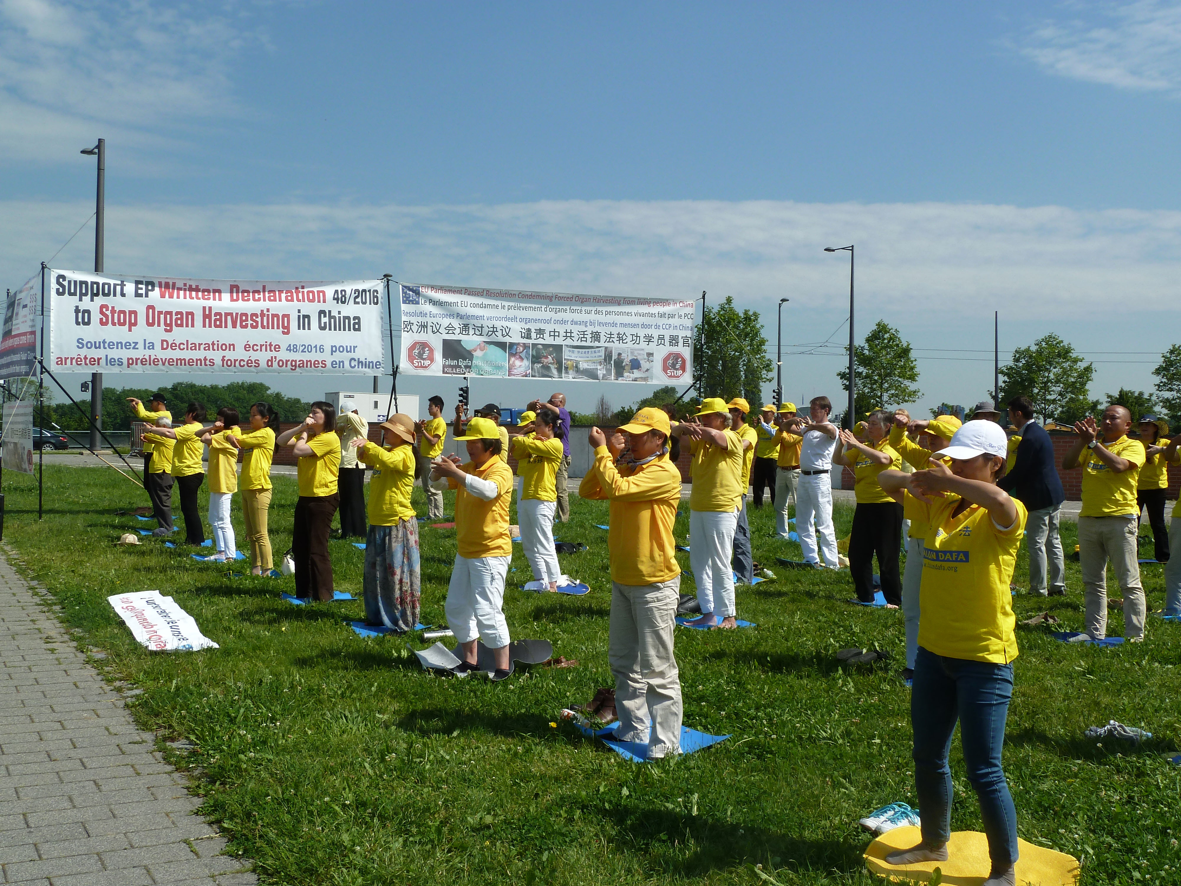 法轮功学员们在欧洲议会大楼外的草坪上炼功,并向路过的议会工作人员和游客分发有关中共摘取法轮功学员器官的信息资料,征集签名。