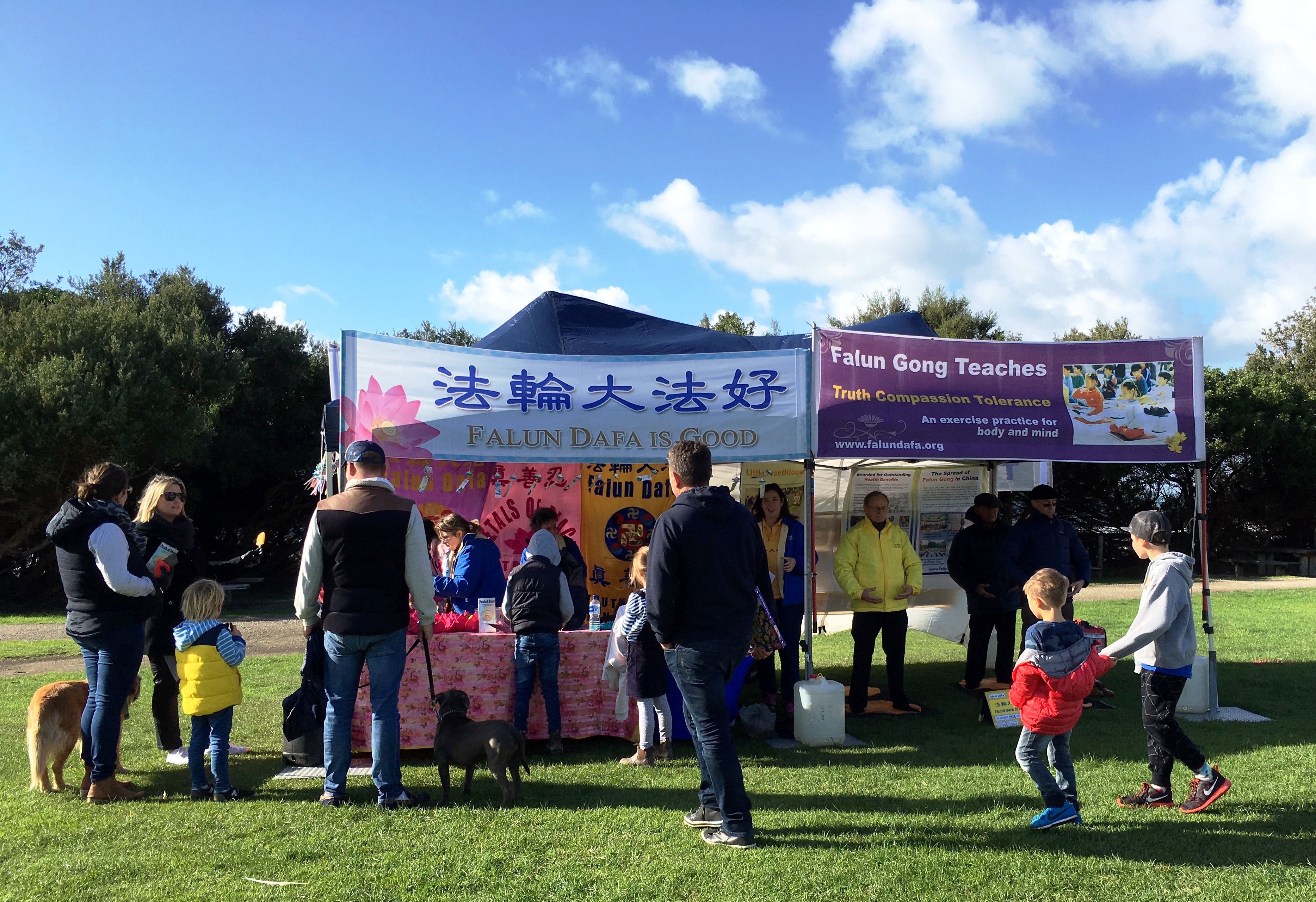 时值六月长周末度假高峰,参加市集的居民以及游客络绎不绝。人们被法轮功祥和的五套功法展示吸引,纷纷在法轮功展位前驻足,很多人因此了解了法轮功的真相,不少当地居民和游客打听如何学炼法轮功。