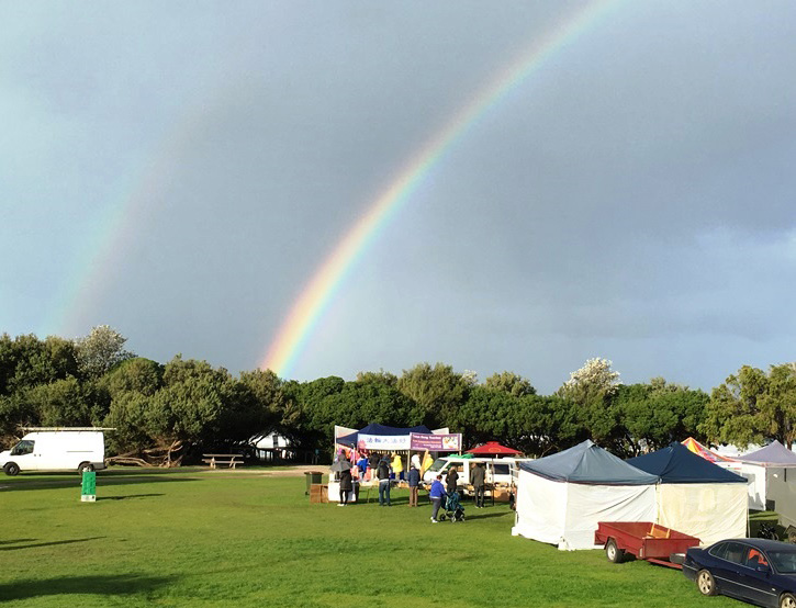 ![]() 南半球冬雨时节,龙恩下了一夜的疾风骤雨,在上午市集开始不久停歇。灿烂的阳光下、风景如画的海滩上,“法轮大法好”的横幅分外醒目。法轮大法展位吸引人们驻足了解真相。 |