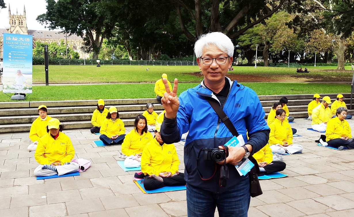 韩国旅游者乔先生(K Hwan Choi)在一边拍摄法轮功学员炼功、打坐场面,他难过地表示:这么好的法轮功学员被中共残忍迫害,真是让我心碎,迫害已持续了十七年,实在是太长了。这是不应该发生的事。中共迫害法轮功的元凶江泽民是魔鬼,他犯下了滔天之罪,应该被绳之以法。