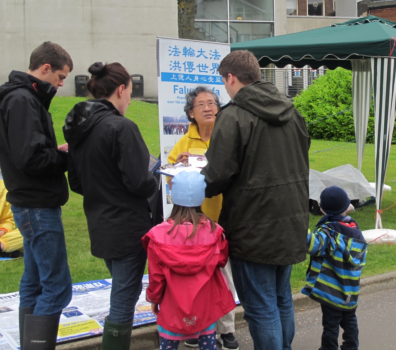 签名后的苏格兰人对法轮功学员表达他们的支持,有的说:“你们做得好!要坚持下去!”有的说:“(中共)真是太邪恶了!”有的说:“谢谢你们!”