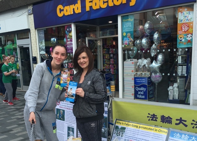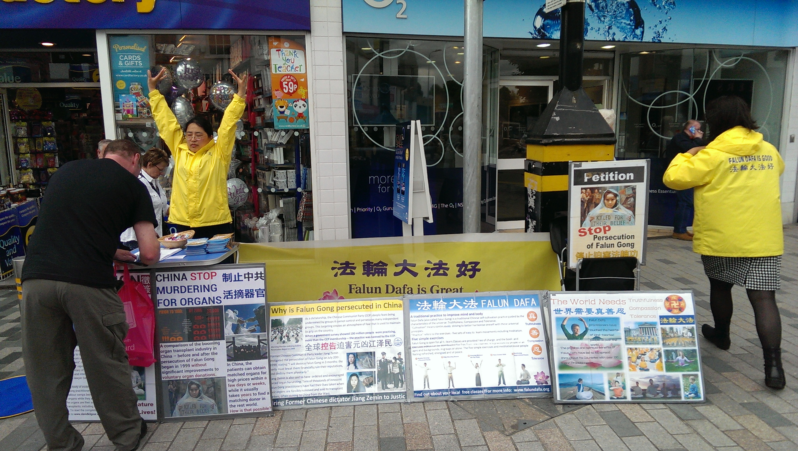 图1:二零一六年六月二十一日下午,北爱尔兰法轮功学员在利斯本(Lisburn)举办征签活动,传播法轮功的真相,并征集签名制止迫害。