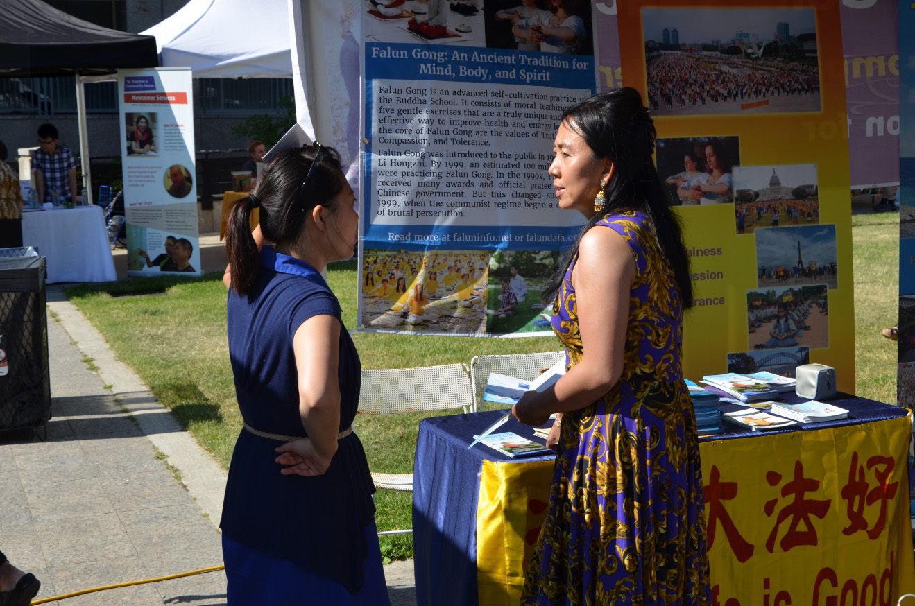 ![]() 图3 :法轮功学员在多伦多国际村节上设立展位,向民众介绍法轮功及其真相。有的民众马上学炼功法。 |