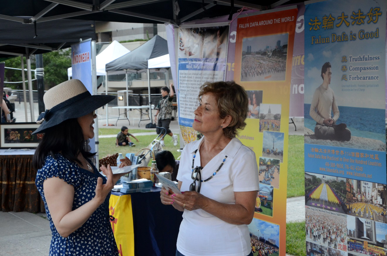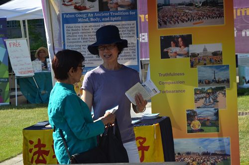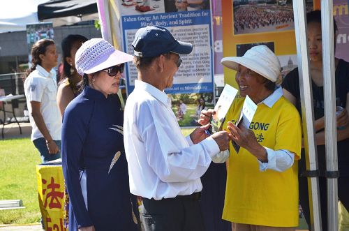 法轮功学员在展位上展示了大法弘传世界的真相图片和资料,并在一旁演示功法,吸引了各个族裔的游客驻足观看。现场有些观众在了解到法轮功是一种修炼方法,以“真善忍”为指导,除了祛病健身还提升人们的道德时,表示也要想修炼法轮功。学员们除了准备了英语和汉语的资料,还特意准备了波斯语的传单,当游客发现有他们民族语言的资料,兴奋地表示回去后一定要上网站上多多了解法轮功。