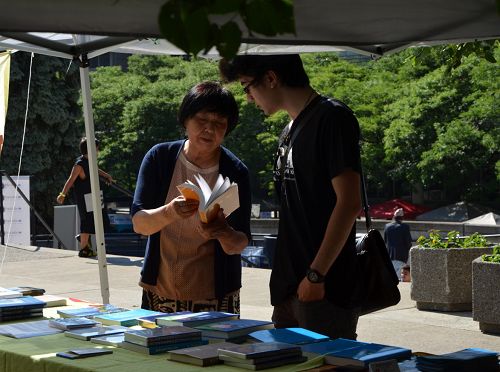 一位大陆的年轻人来到摊位前询问,学员详细的讲解让他频频点头。还有很多游客特意赶到摊位前索要书店的名片表示要预约时间到书店购买书籍并参加九天的学法开始修炼法轮功。