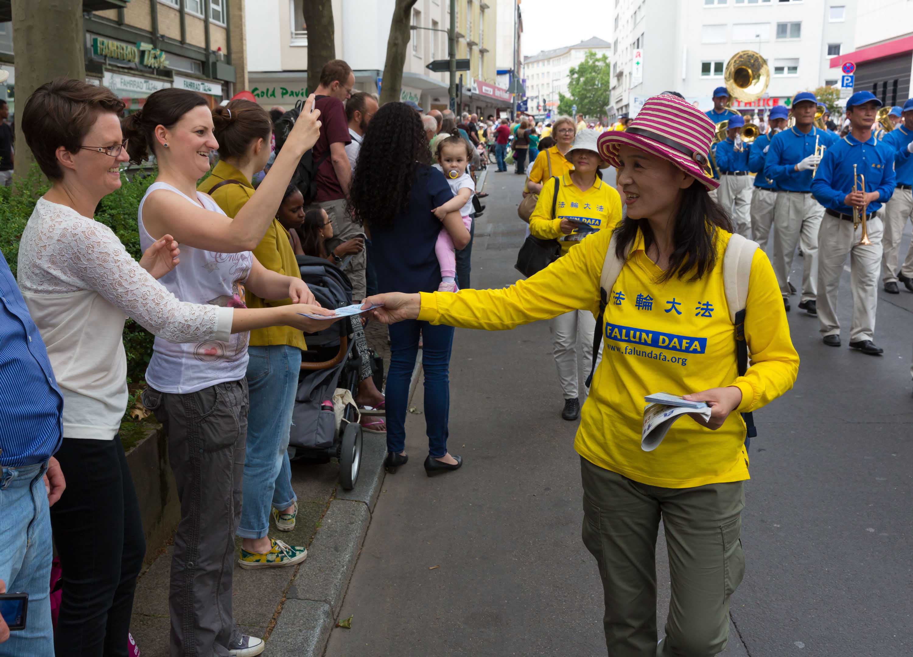 游行队伍从美茵河畔出发,经过法兰克福闹市区和购物中心、歌德故居,最后抵达市政府所在地的罗马广场,沿途民众非常热情,人们被天国乐团的音乐震撼,纷纷接过法轮功学员手中的资料。当他们看到法轮大法花车和仙女队伍时,不少人拍照留影,纷纷掏出手机和照相机摄影留念。当他们看到法轮功学员受中共迫害,仍在传播真相时,肃然起敬。