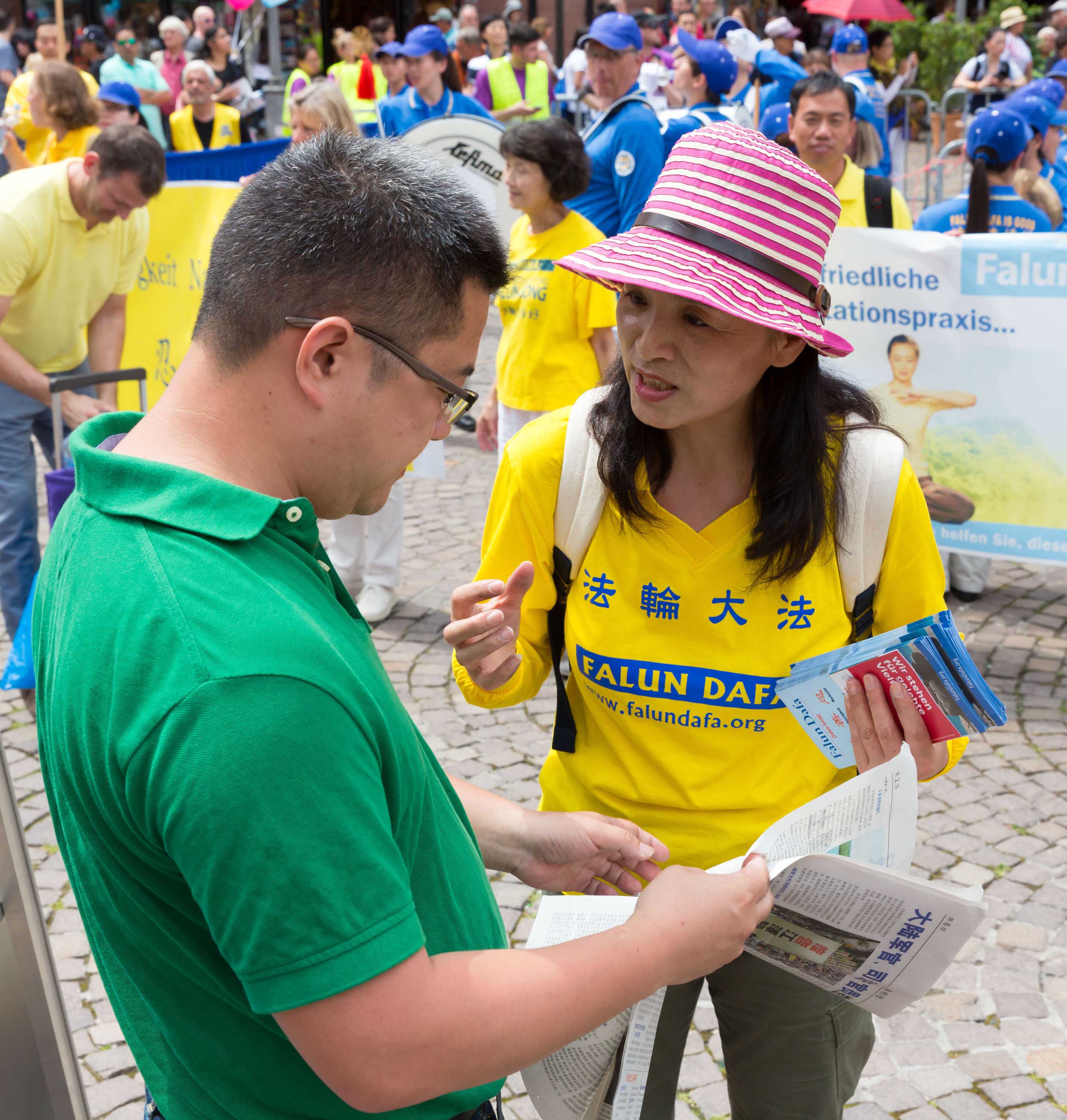 一位德国女士非常认真的看法轮功学员的游行队伍,主动走向发资料的法轮功学员索求资料,她了解了法轮功被迫害的真相后,还询问在什么地方可以学炼法轮功。最后她非常的感动说:“我真的非常感谢神把你送到我跟前。”