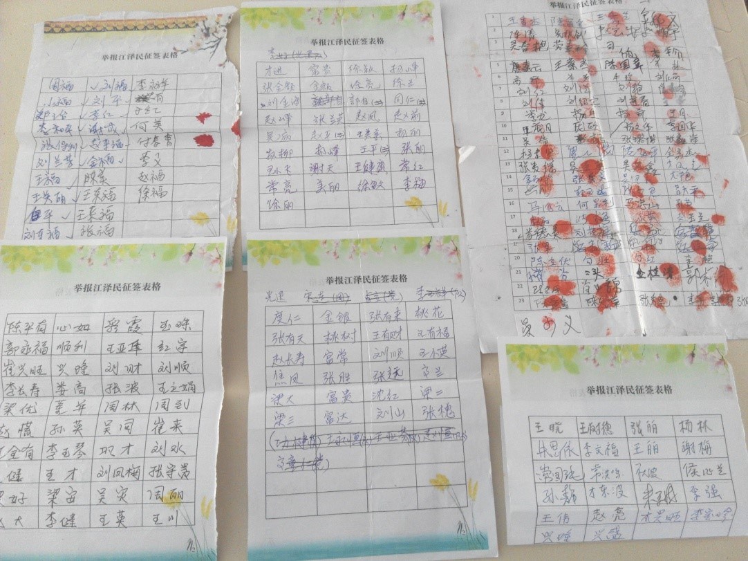 ![]() 图为部分举报迫害元凶江泽民的民众签名 |
