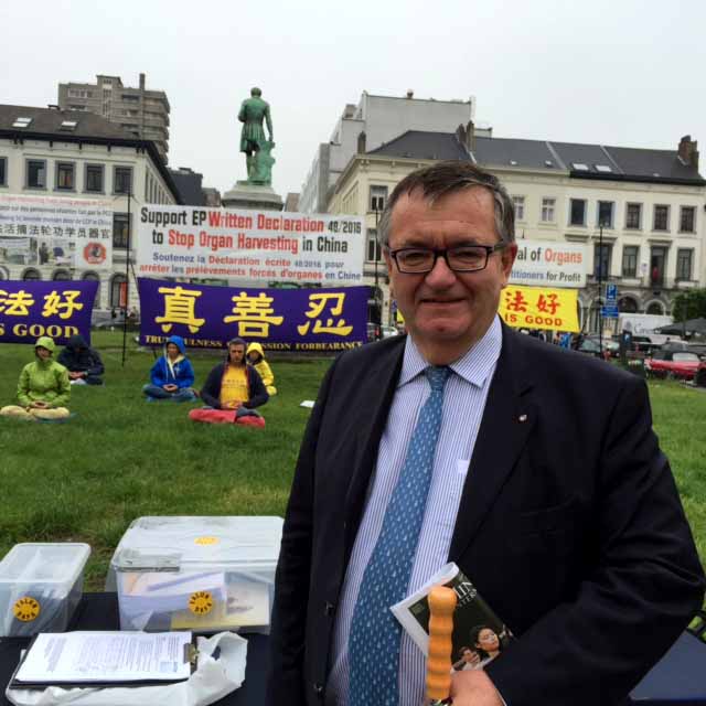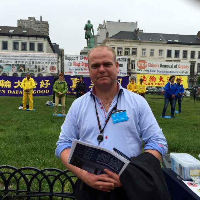 佘泊思(Stefan Schepers)先生来到活动现场,仔细阅读展板上揭露中共迫害法轮功的罪行以及国际社会反对中共活摘法轮功学员器官的报导,然后他走到资料桌前,看到“反活摘器官”的征签簿,签下自己的名字和联系方式。他说:我是公司商业顾问;我是通过报纸和你们的活动了解法轮功的。我知道中国政府侵犯人权。所以我想你们的活动很重要,可以引起欧洲的注意。他们跟中国的合作不应该以欧洲和中国的人权作为代价。