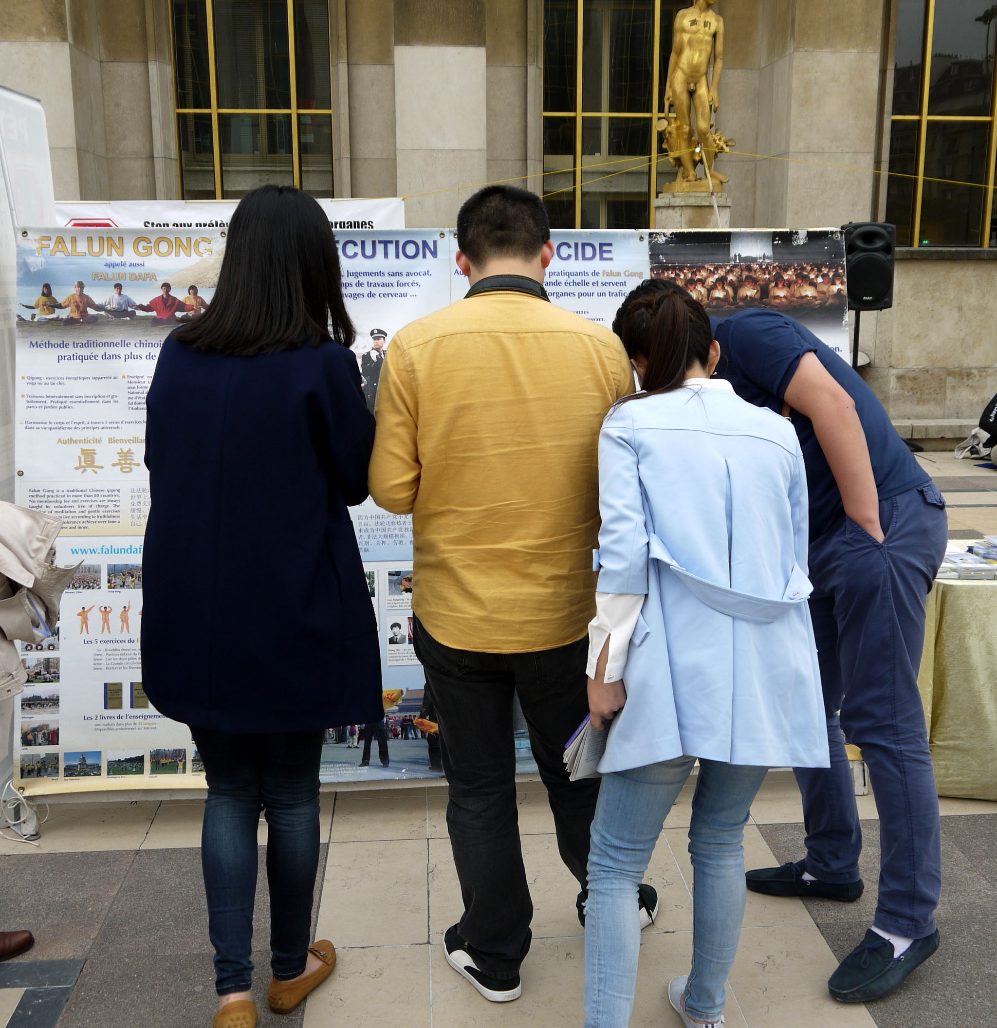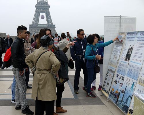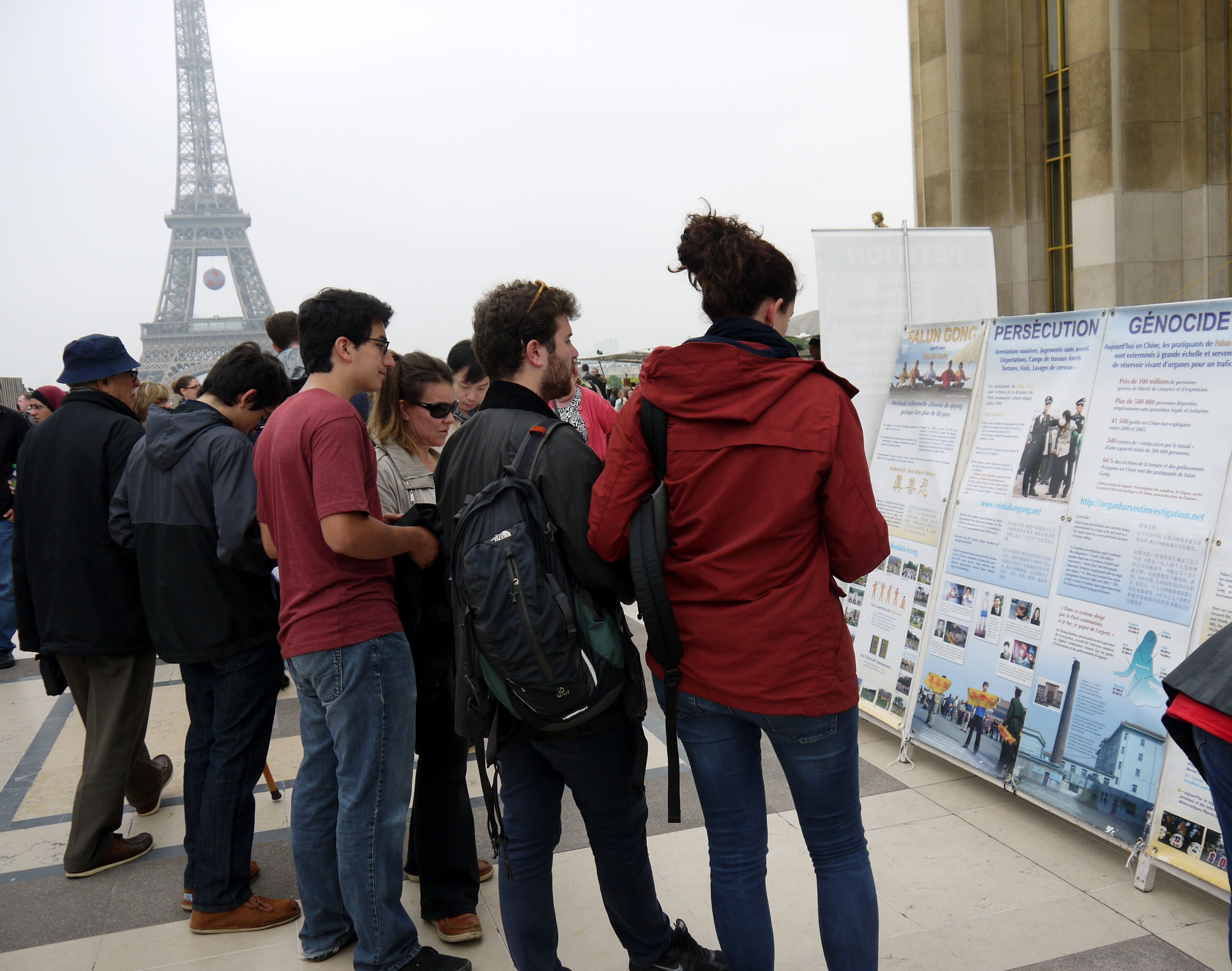为了反对这场迫害,并尽早结束它,巴黎的法轮功学员和往常一样,在周末来到巴黎艾菲尔铁塔下的人权广场,向来自世界各地的游人和法国民众展示功法,讲述法轮功在中国被迫害的事实,同时向游人民众征集签名,谴责中共活体摘取法轮功学员器官。