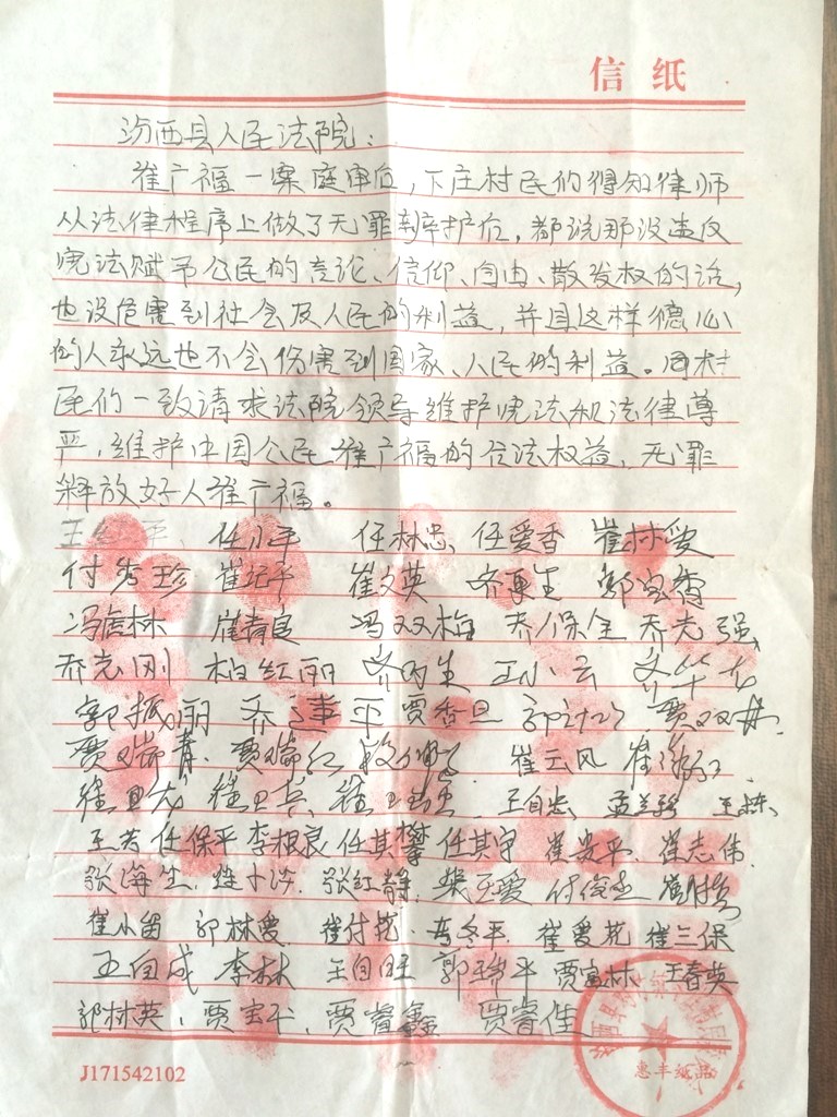 原来,仅仅是因为崔广福行使公民权利,依法向最高人民法院、最高人民检察院控告了 幸遇法轮功 崔广福获得了第二次生命 崔广福,五十岁,汾西县对竹镇下庄村村民。上世纪九十年代,崔广福以贩药为生。那个时候贩药的利润非常高,比如人们最常用的感冒药——感冒通,那时汾西县药材公司批发价为每袋1.84元~1.86元,而他去批药的地方每袋仅仅0.23元。那时农村村民主要以种地为生,年收入二千元就已经算高了,但是崔广福通过贩药,每年可以挣到一至二万元。 就这样短短几年时间,崔广福就富裕起来了。由于不怎么种地,时间很充裕,他开始以打麻将消磨时间,渐渐的越来越离不开麻将桌,有时一玩就是好几天。长时间恋在麻将场上,使得他身体越发虚弱,直到一九九八年春天,经常昏厥过去。 那些日子,一到晚上,崔广福三岁的小儿子总是哭闹不停。而这边他却随时昏迷,有时一小时发生几次,发作时间多则几分钟,少则几秒钟。崔广福的大儿子情急之时,看着妈妈要哄小弟弟睡觉,又怕爸爸昏迷不醒,七、八岁的他,常常也顾不得多想,漆黑的夜晚就去找乡村医生求救、找叔叔姨姨们帮忙。 后来家人把当地老中医请到家中给他诊断病情,老中医诊断后说,“不用开药了,就在家静养好了(言外之意是不行了)。”崔广福预感病情不佳,就问是不是不能活了?老中医安慰着解释说,就像人睡觉一样醒就醒,不醒就过去了。 家人情急之下哀求老中医,“家里两个儿子还这么小,他却病在床上躺着,您一定行行好,给开点药。”老中医心里知道崔广福已病危,也怕有风险承担责任,但是又看到了家人那颗真诚相求的心,于是在家人立即承诺担起一切后果的情况下,开了一副中药。就这样吃了有百八十副药后,老中医说让缓缓再吃。 待秋天时,一天早晨起床后,崔广福昏迷又发作了,全身无力,水也不能挑,其它活就更不能干了,就这样又找到老中医给他开药吃。慢慢的他又能走路了。 一天上午,家人让崔广福独自去抓药,他中午回家说,没去找老中医,并告诉说,从家里到他妹妹裁缝铺有一百米距离,就歇了两次,全身都没有劲。后来碰到一个朋友给他说,他妈以前生病吃药打针都没效,又找阴阳先生给看,也是先生在就好,先生走就发作,后来修炼法轮功按真善忍标准严格要求自己,现在身体好了。 于是,崔广福决定下午也去找找炼法轮功的人,让教教他炼功动作。就这样他走入了大法修炼,沐浴在大法至高至简的法理中。崔广福在修炼大法后,开始按照真善忍的标准做好人。他认识到,人不管做了什么坏事自己都得偿还。他想到在无工作证、职业证、药检证的情况下贩药是违法行为,于民不利,就主动停止了这个轻松赚钱的生计。 通过修炼法轮功,崔广福身体变好了,再没有出现过昏厥的现象。除了身体健康没再吃过药之外,他的心灵也净化了,内心更加的平和,待人更加恭敬友善,能够做到为对方考虑,不再有意伤害别人。 村民们看他身体和精神上的变化后感到不可思议,经常说,法轮功真神奇,能让一个人不吃药身体就好了;能让一个从麻将场拽也拽不回来的麻将迷,再也没摸过麻将;要都是这样的人多好呀,没国家批准的手续就不去倒卖药品,自觉遵纪守法。 履行公民义务上访,被非法劳教一年 一九九九年十二月二十六日,崔广福听说最高人民法院将公开庭审法轮大法研究会王治文等四人时。他和几个同修抱着一颗对政府、国家赤诚的心去北京看看开庭。想弄明白,作为按照真善忍标准修炼法轮功的人是咋样犯了国法的。 当他们走到天安门附近时,一穿军大衣的人问是不是炼法轮功的。还没等回答,那人就说,你骂师父(军人说师父的名字,意思不骂就知道是修大法的)。崔广福说,骂人不好,为啥要骂人呢? 那人说你一定是炼法轮功的,说话间军人手就伸进大衣内,二三分钟功夫,一辆警车就停在他们面前,连推带拽的把他们弄上警车,送至天安门广场附近的一小平房内登记姓名地址。后来临汾驻京的汾西县警察用车把他们拉到汾西县拘留所,非法拘留了十几日。回家后过了一段时间,崔广福却被以“利用邪教破坏法律实施罪”非法劳教一年。 依法诉江 崔广福被非法判刑三年 民众声援 二零一五年五月一日,中国最高法院发布了“有案必立,有诉必理”的通告后,至今国内已有二十多万法轮功学员及家属向最高检察院和最高法院实名控告江泽民(简称诉江),提请最高检察院追究江泽民在迫害法轮功的责任中所犯下的罪恶,追究江泽民的刑事责任。 有目共睹,崔广福在大法修炼中真正受益。当他知道了“两高”发的通知后,想到十七年来,那么多百姓受到江某的造谣宣传对佛法产生误解;那么多在公检法人员在其蛊惑和欺骗下没有任何法律依据的追随其迫害法轮功学员。于是他决定行使公民的合法权利,为大法说句公道话,为大法师父说句公道话,也向两高邮寄了实名诉江的控告书。 二零一五年十月三十日,崔广福被非法刑拘。二零一六年三月四日,汾西县法院对崔广福非法庭审。北京律师余文生为他做了无罪辩护,余律师在法庭上把检察院的公诉人驳的哑口无言,后来法官只得草草收场,宣布休庭。 没想到二零一六年四月一日,家人却收到了汾西县法院的刑事判决书,将崔广福非法判了三年。下庄村村民们得知律师从法律角度做了无罪辩护后,明白了修炼法轮功不违法,是宪法赋予公民的言论自由、信仰自由