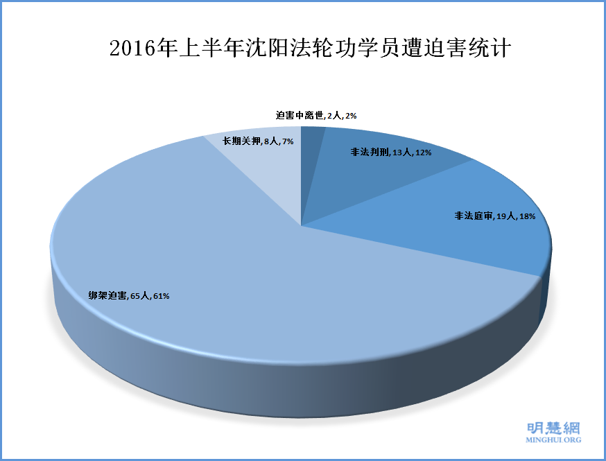 【明慧网二零一六年七月十三日】(明慧网通讯员辽宁综合报道)据明慧网资料统计:二零一六年上半年,辽宁省沈阳市地区至少有两名法轮功学员被迫害离世,十三名法轮功学员被非法判刑,有十九名法轮功学员被非法庭审,有八人被非法长期关押,至少六十五名法轮功学员被绑架迫害。