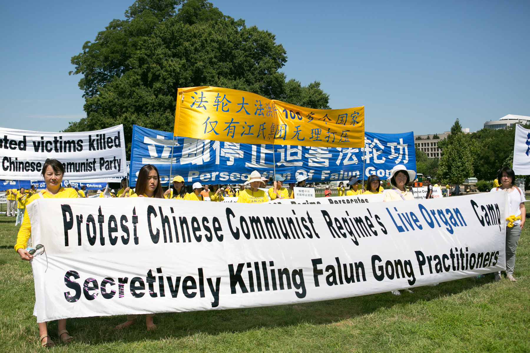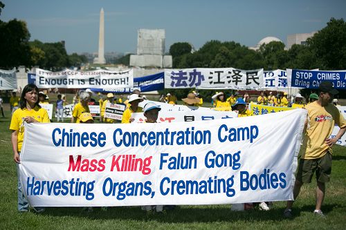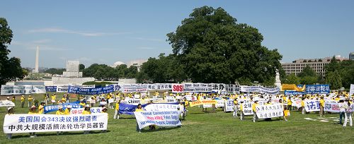 二零一六年七月十四日中午,来自美国各地的部分法轮功学员及支持者在美国首都华盛顿国会山西草坪集会,呼吁国际社会制止中共对法轮功长达十七年的残酷迫害。十九位美国国会议员来到现场或致函声援这场集会,承诺和法轮功学员一同制止中共迫害。华府多个非政府组织代表在集会上呼吁共同制止中共强摘法轮功学员器官。