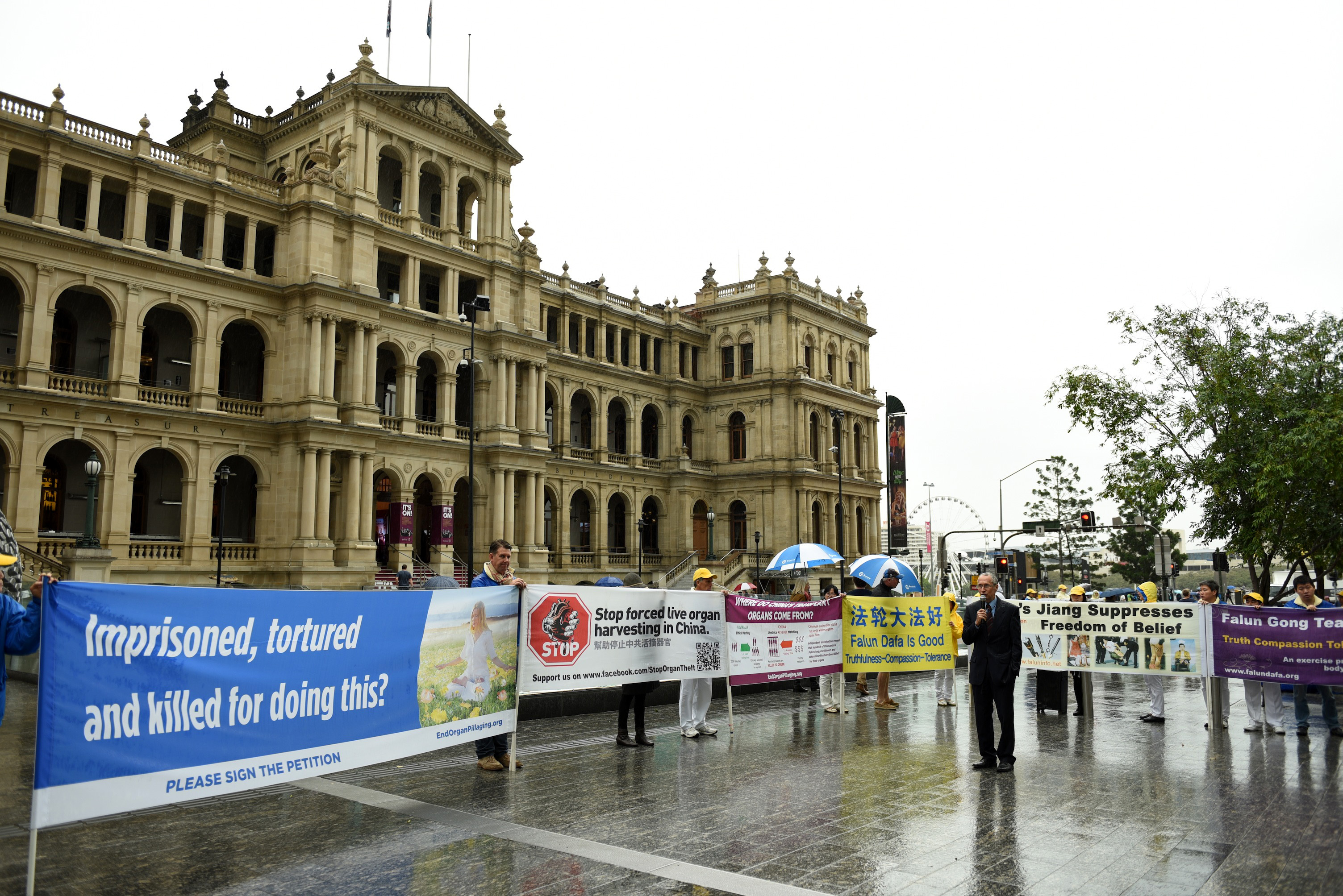 当天细雨绵绵,好似苍天都在为蒙冤受难的法轮功学员流泪,悼念那些被中共邪党迫害致死的秉承真、善、忍法理做好人的修炼者。昆士兰法轮大法分会发言人约翰·安卓斯(John Andress)对记者说:“这场残酷的迫害已经持续十七年了,很多人被迫害致死,致残,家破人亡。特别是二零零六年揭露出来的活摘器官的罪行,更令全世界震惊。据有充分依据的独立调查报告揭示,中国大陆参与器官移植的医院每年器官移植的总数高达四万到六万个,累计下来,估计器官移植数量高达上百万,而绝大多数器官都来源于被非法关押的法轮功学员。”他呼吁国际社会更加关注此“地球上从未有过的邪恶”,共同制止迫害,并将罪魁祸首绳之以法。