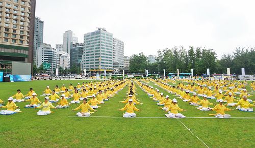 ![]() 图1~3:二零一六年七月十七日,‘720反迫害17周年’集会前,韩国法轮功学员集体炼功。 |