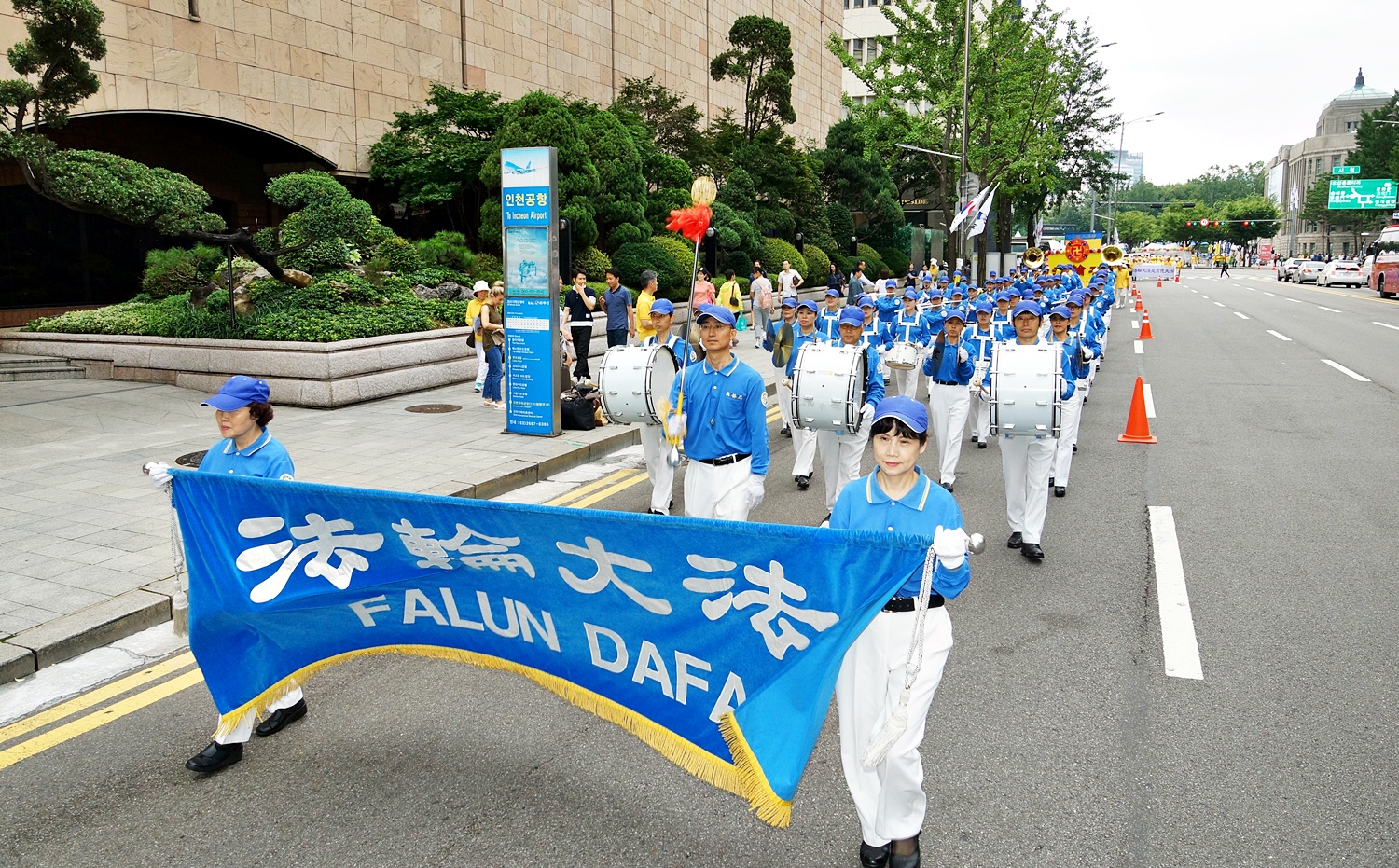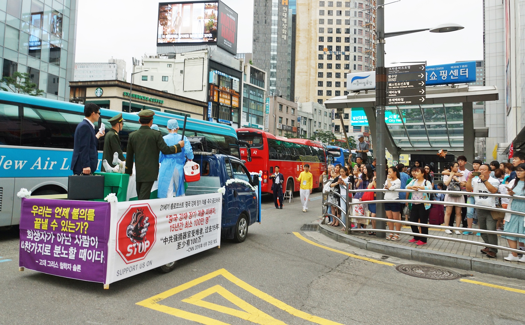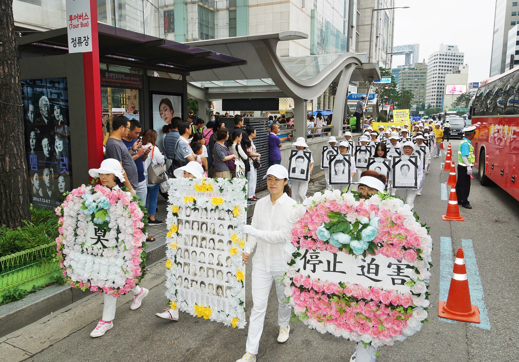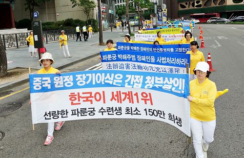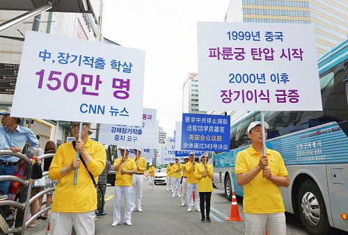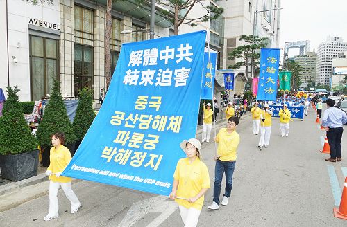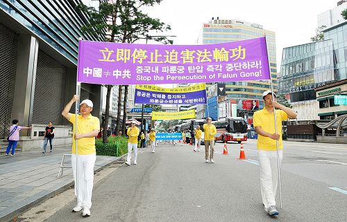 当天上午,韩国法轮功学员在首尔市政府前的首尔广场集会,下午则在中国游客最多的明洞一带举行了盛大游行。