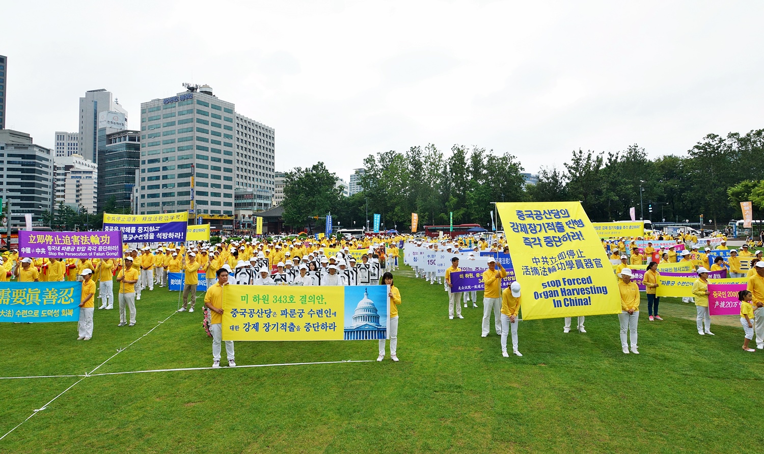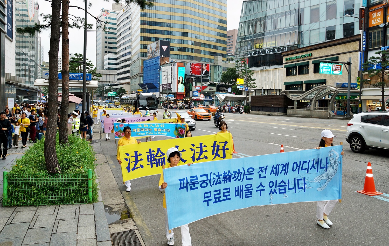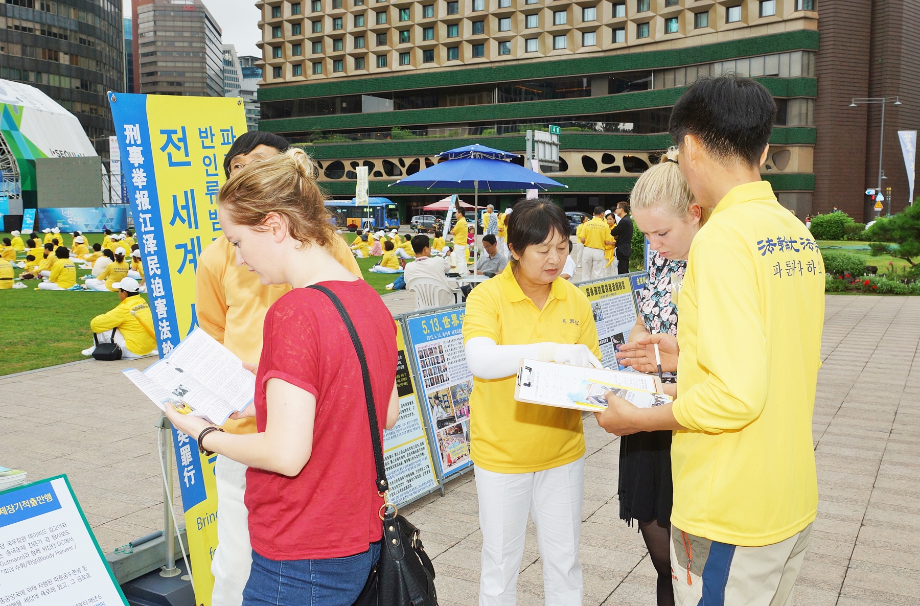 当天上午,韩国法轮功学员在首尔市政府前的首尔广场集会,下午则在中国游客最多的明洞一带举行了盛大游行。