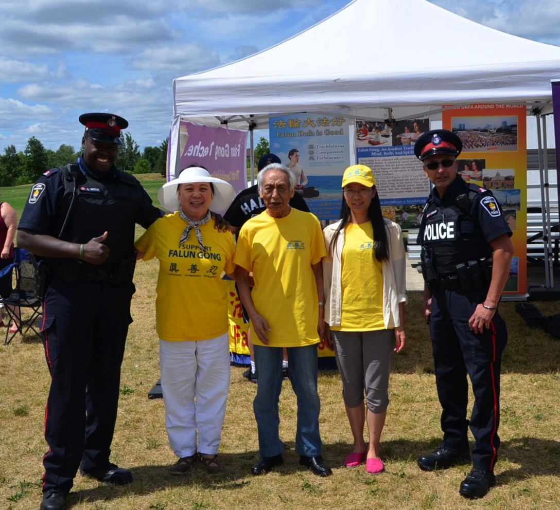 旺市(Vaughan)位于多伦多北部的约克郡(York Region),一清早,布置好位于主席台正对面的展位后,法轮功学员们开始准备炼功,印有“法轮大法好”的横幅格外醒目。负责活动治安的阿里(Ali)警官和他的搭档来到展位前向学员们问好,学员们向他们介绍法轮功修炼:“真、善、忍”以及法轮大法在全球一百多个国家和地区弘传,还获得三千多项表彰以及学员参加社区活动的情况后,两位警官高兴得与学员合影,还竖起大拇指表示称赞。