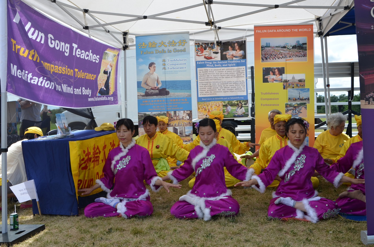 由法轮功学员组成的腰鼓队,在参加完节日主办方组织的为和平祈祷,要求停止暴力和歧视的游行后,也来到展位前参与法轮大法五套功法的展示,靓丽的服装、舒缓优美的功法吸引了大批的游客驻足观看和拍照,其他的学员们向在场的民众介绍法轮大法以及法轮功在中国大陆受迫害的情况,特别是最近美国众议院和欧洲议会通过的决议案呼吁停止活摘法轮功学员器官,很多人拿走了传单。