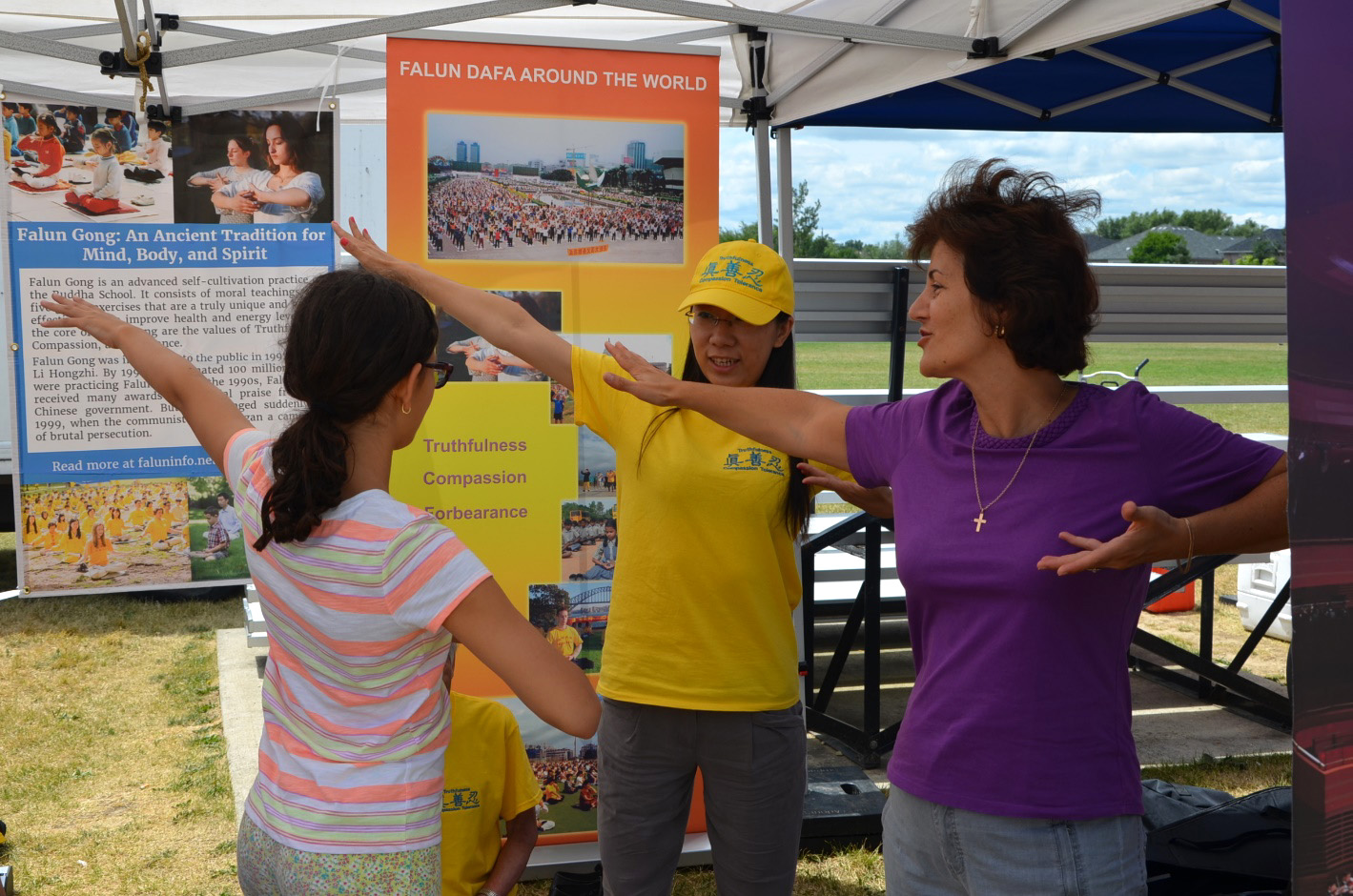 专业从事理疗的安娜(Anna)女士到法轮功的展位前,她告诉学员她没有听说过法轮功,但看到学员炼功打坐都非常平和,尤其惊叹学员们身上强大的能量场:“他们在炼功时就像坐在罩里一样!”学员告诉她一九九八年时中国大陆曾有关于法轮功学员健康状况的调查报告,祛病率超过90%,平均每人节省医药费两千多元,在震惊之余她还向学员询问了当地法轮功的联系信息,表示要更多的了解法轮大法。