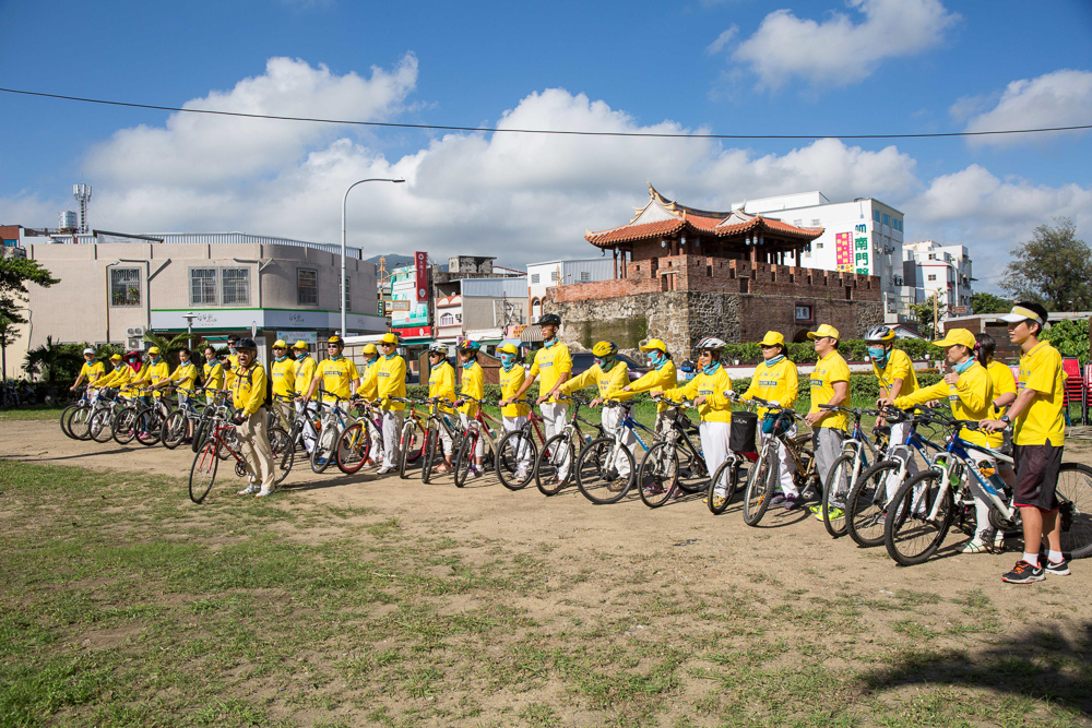 恒春半岛周末假日,游人如织,车流络绎不绝。横跨老中青三代、约20多位法轮功学员组成一支真相单车队,身着有“法轮大法好”字样的黄色T恤,从恒春南门启程,一路骑向核三厂,伴随车队行经处,法轮功学员向游人发送真相资料。在高师大音乐系就读的怡玲说,当红灯停下来时有游客跟大家比赞,并大声喊“法轮大法好,加油!”