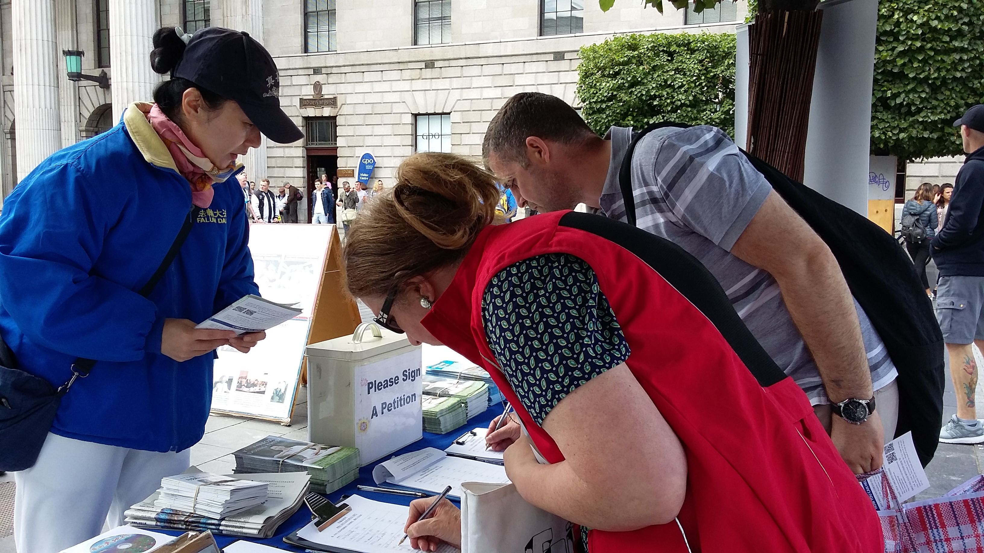“但是在我们爱尔兰这个伟大的国家,我们拥有自由,没人禁止我们作为爱尔兰人,和法轮功(学员)团结站在一起 ,并把我们的抗议告诉中共政府;在这个美好的七月份的一天,我这里郑重邀请过路的各位,无论是购物还是休闲,长发的短发的,所有的人,建议你来看看这些信息展板,并且签上你的大名。”