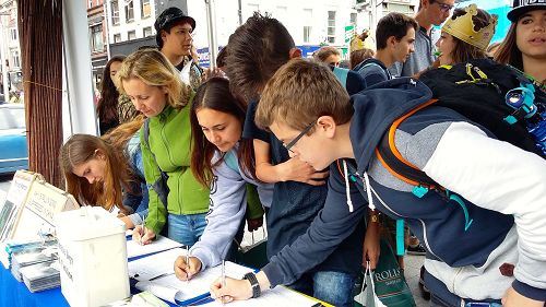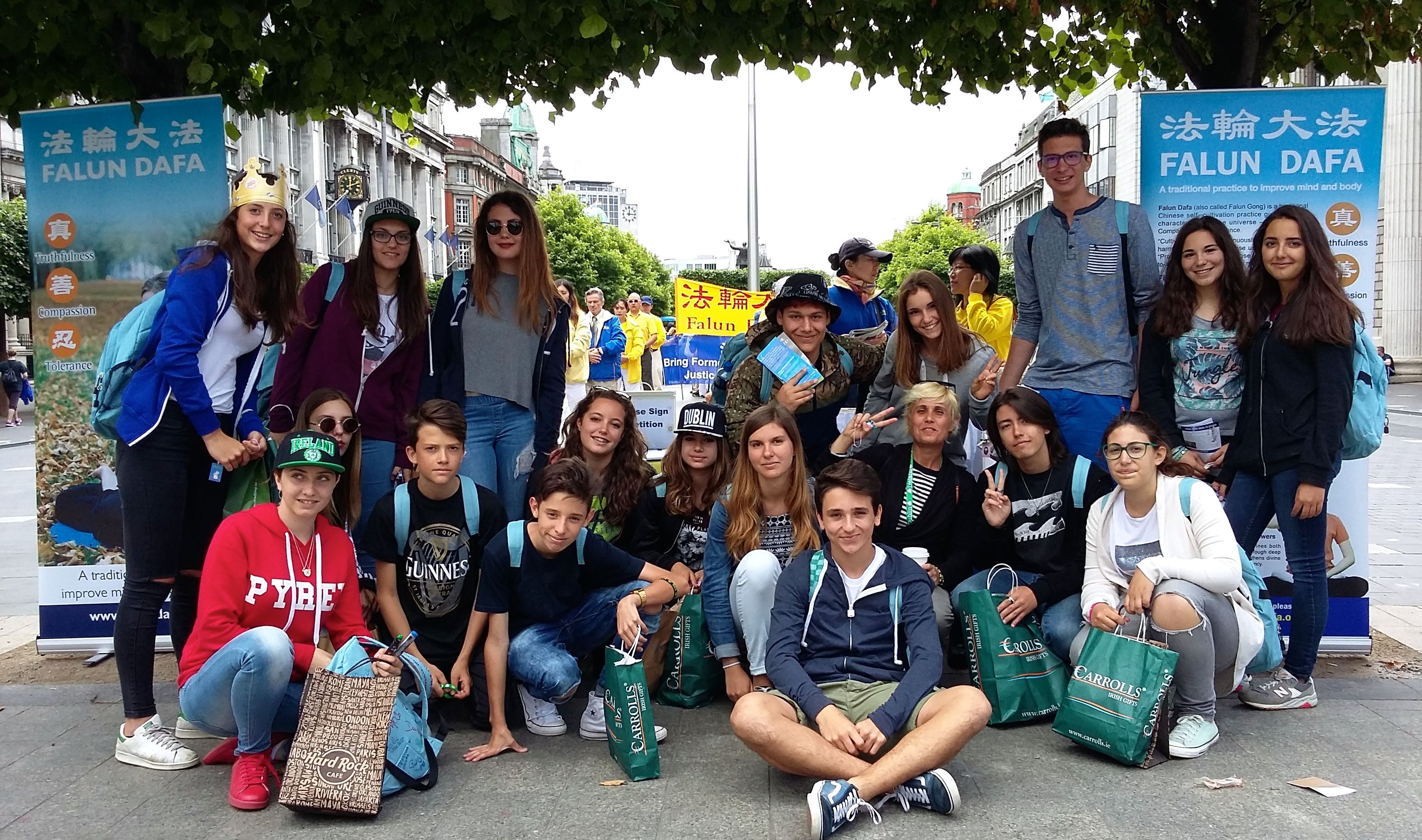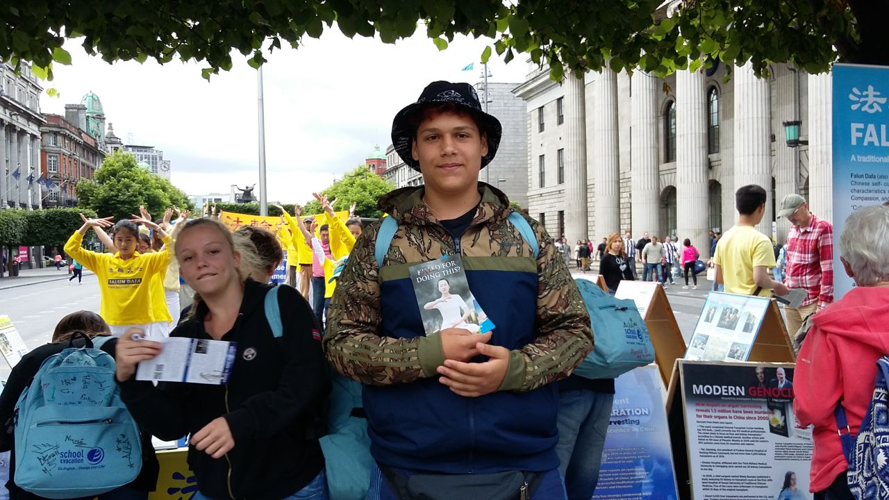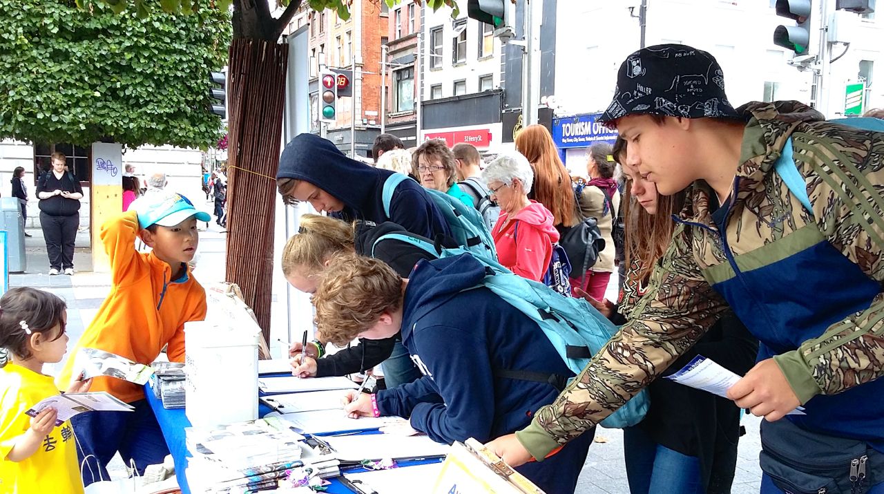 一位来自意大利的少年安东尼奥,不仅自己签了名,还把他的同学和老师都招来签名,他和他的同学们前后在机会地点待了半个多小时。这是一群来爱尔兰学习英语的意大利的学生,带领他们的是女老师卡米拉。她表示自己以前从来没听说过法轮功,也不知道迫害这样的残忍。她很高兴他们今天在这里遇到法轮功的机会,能够让孩子们了解这个世界上更多的事情,因为他们第二天就要回意大利了。