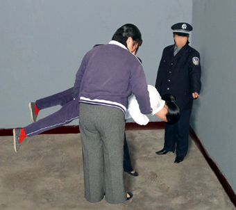 ![]() 酷刑演示:坐飞机,将法轮功学员整个身体抬起来,平着身子,将头撞向墙 |