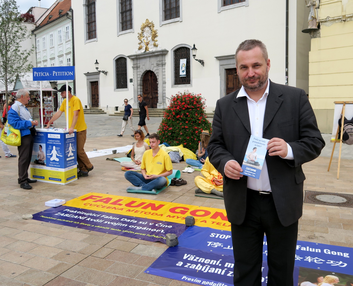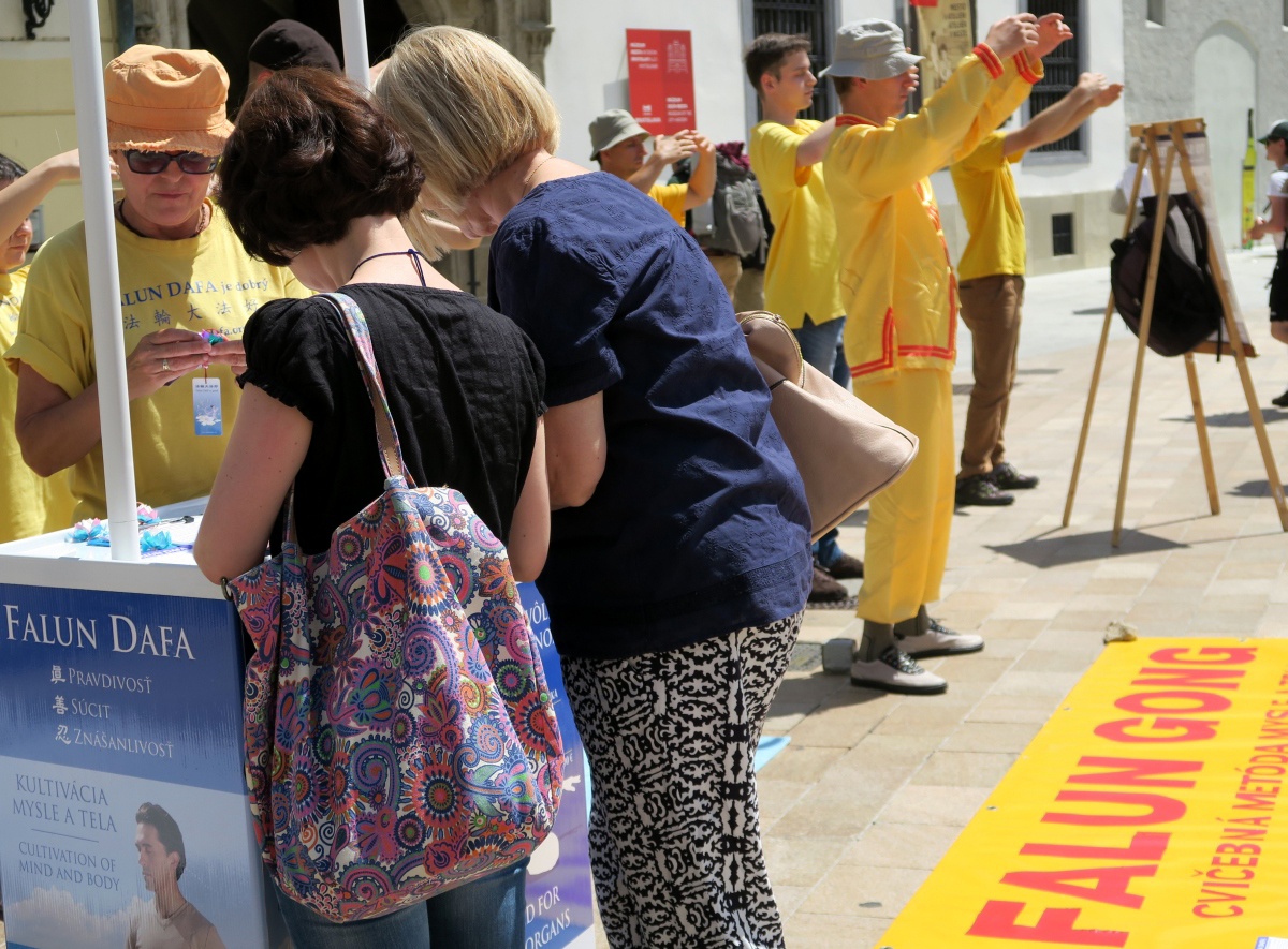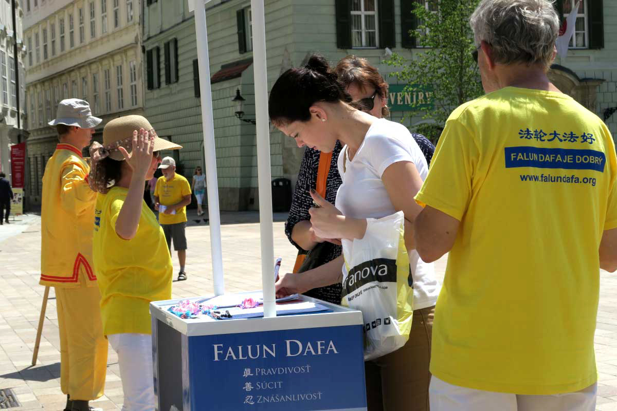 许多来自西班牙、意大利、奥地利和其它国家的游客了解了中共对法轮功迫害的真相,并在反迫害征签表上签名。来自中国的游客见到斯洛伐克也有法轮功学员,露出惊讶的神情,连声说:“法轮功,法轮功。”
