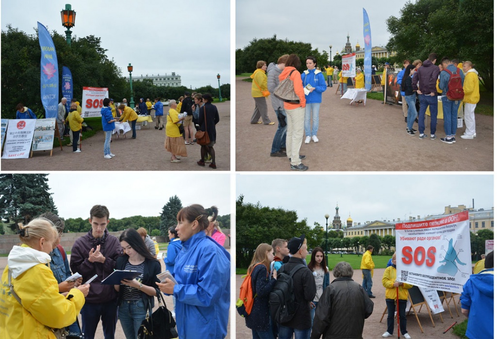 图7:二零一六年七月二十日,反迫害十七周年,俄罗斯法轮功学员在圣彼得堡传播真相,并征集签名制止中共活摘法轮功学员器官,制止迫害。了解真相的民众签名支持。 |
