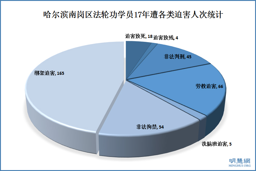 据明慧网报道不完全统计,十七年来,哈尔滨市南岗区非法判刑、劳教迫害的法轮功学员为: