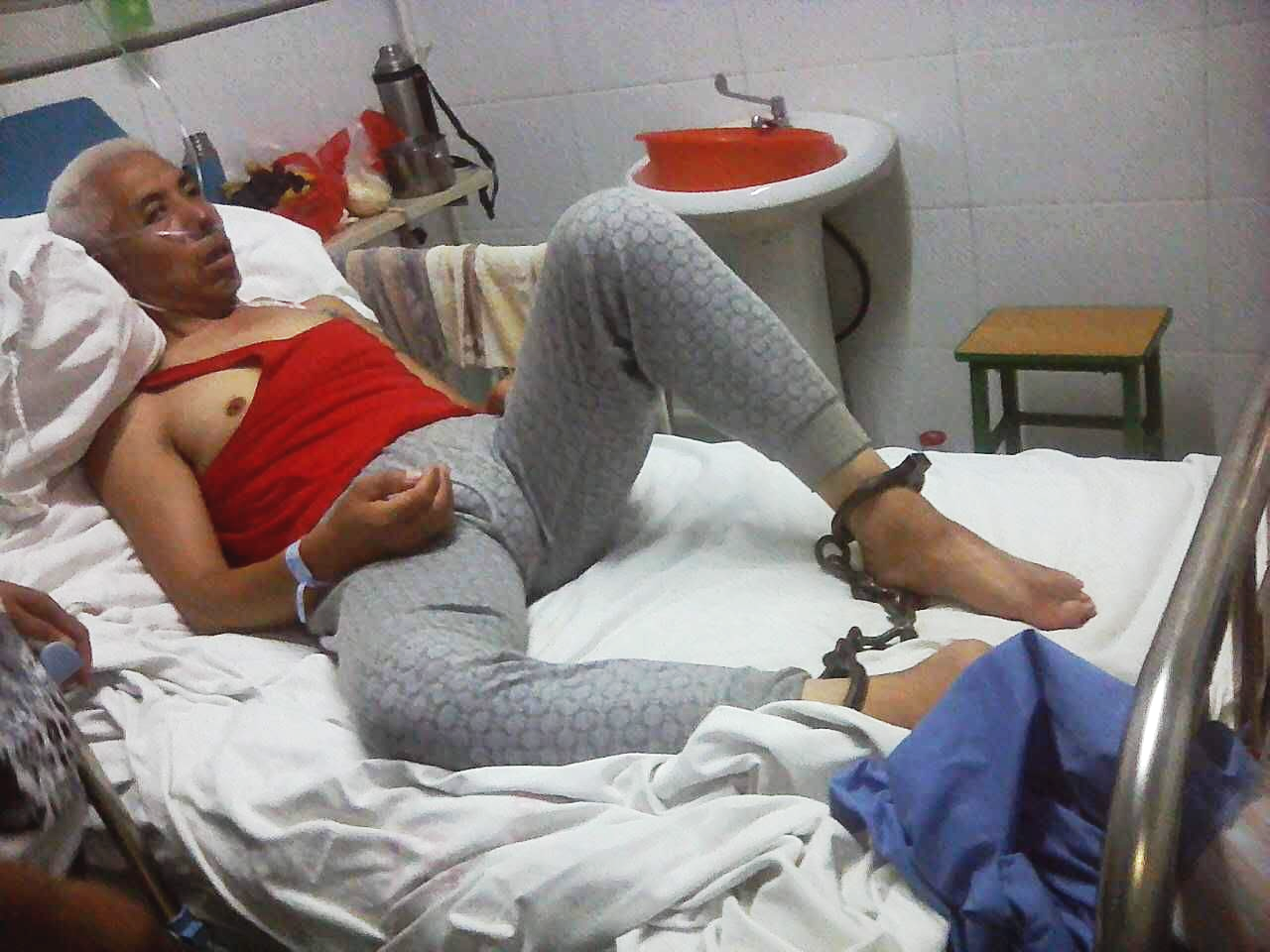 崔广福在临汾市地区医院,双脚戴着脚镣