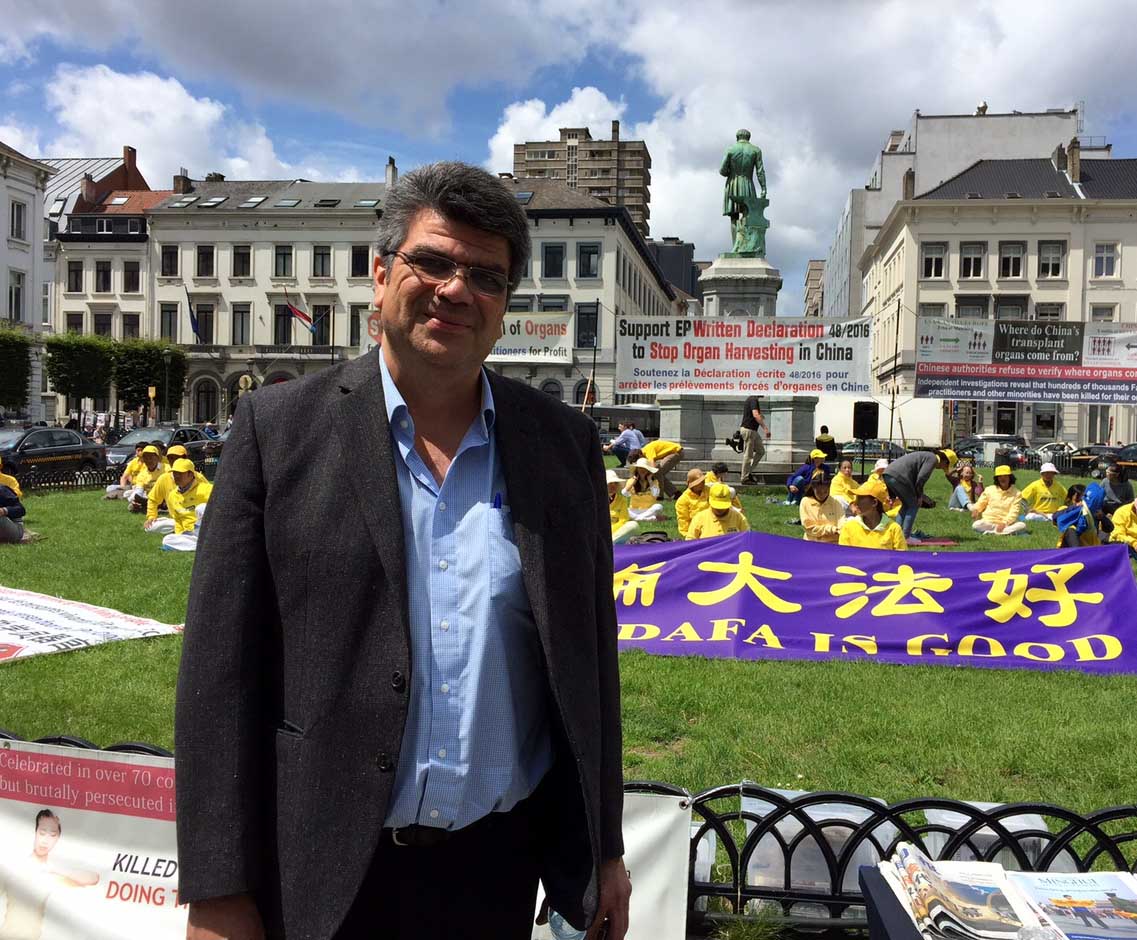 Said先生来自摩洛哥,是一位牙医。知道了中共活摘法轮功学员器官并牟取暴利,他表示:“我以前完全没注意到这件事。这太可怕了,怎么能做这种生意?太可怕了!这是(人类)最大的悲哀。我非常遗憾,为那些被强制施加了这些痛苦的人群。我是百分百地站在抗议(迫害)的一边,尤其是在欧洲议会前面抗议的一边。”
